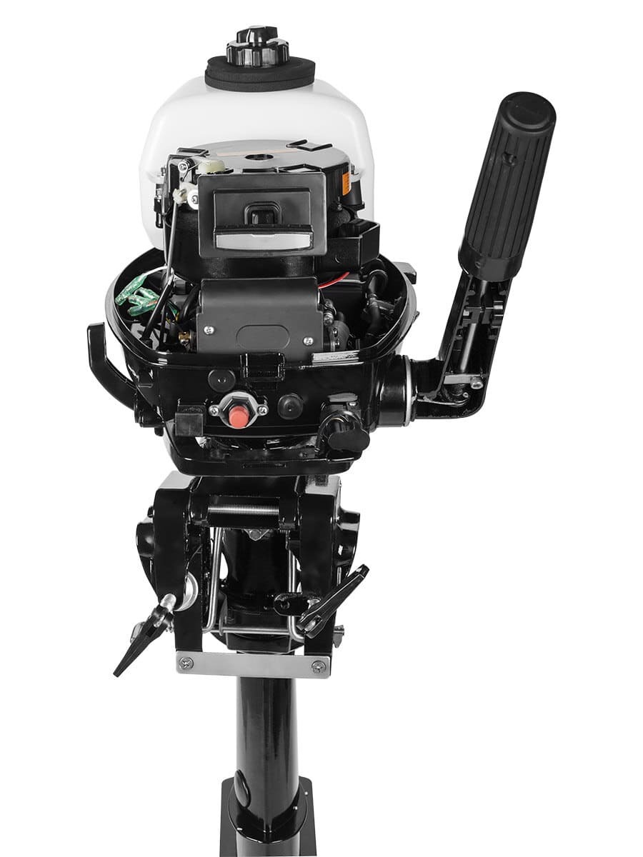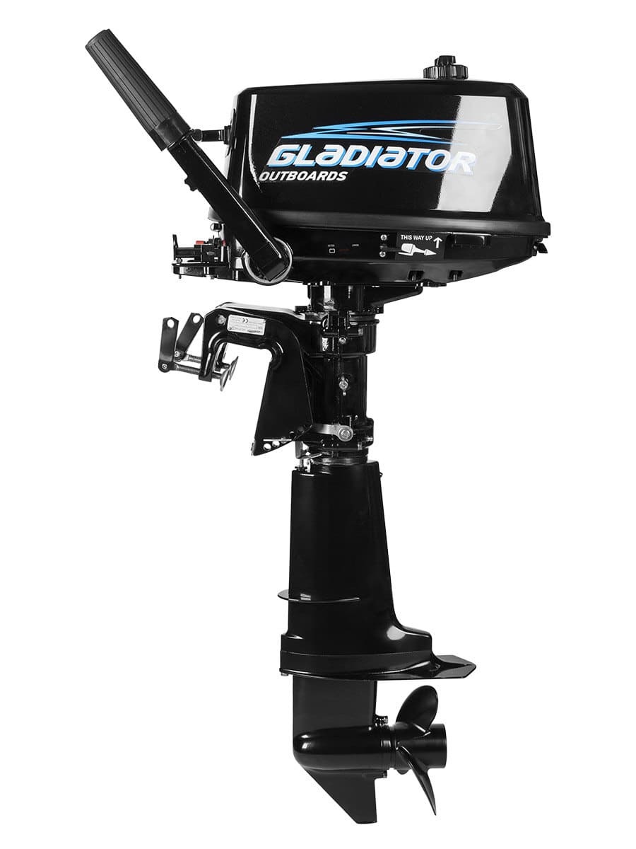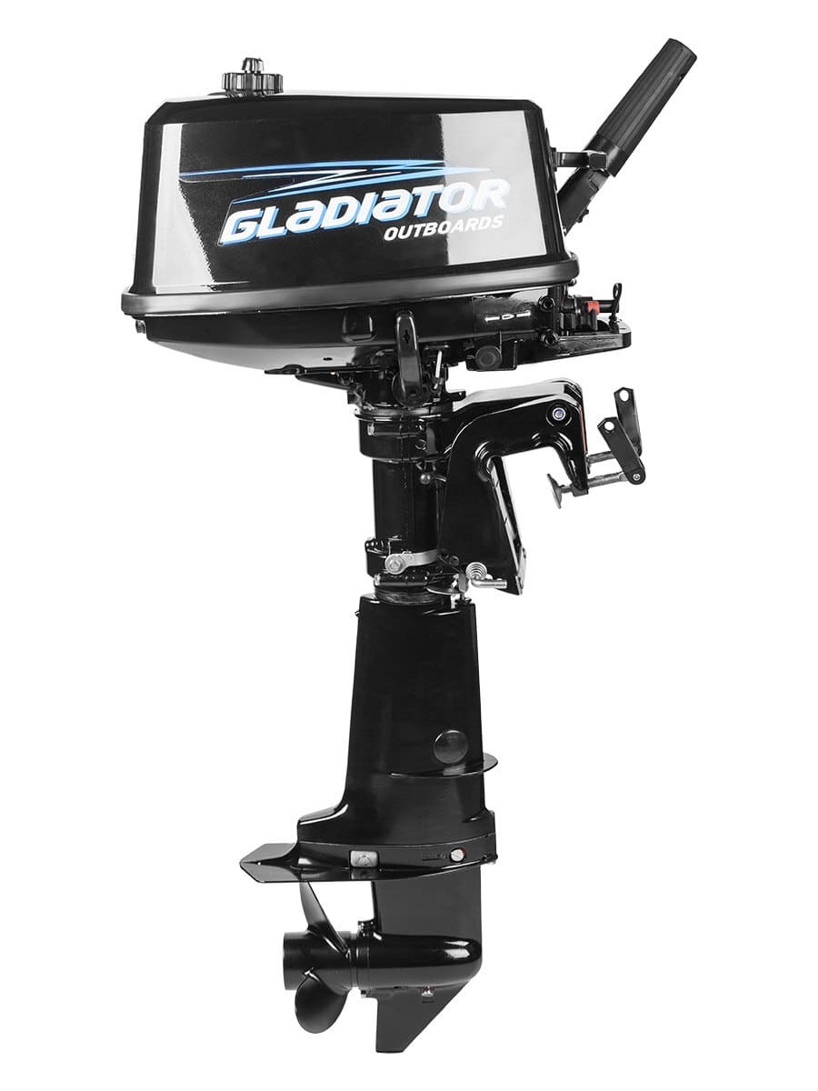 GLADIATOR G 5FHS — 2-х тактный подвесной лодочный мотор мощностью 6.2 л.с. Мотор оборудован встроенным топливным бачком увеличенного объема (2,5 литра) и имеет возможность подключения внешнего топливного бака. Выбор топливного бака (встроенный или внешний) осуществляется путем переключения краника, расположенного на корпусе мотора. Внешний топливный бак соединяется с мотором топливным шлангом через быстроразъемные коннекторы (возможно переключение с одного бака на другой без выключения двигателя). В качестве топлива используется заранее подготовленная смесь (предварительное смешивание) в соотношении 50:1.