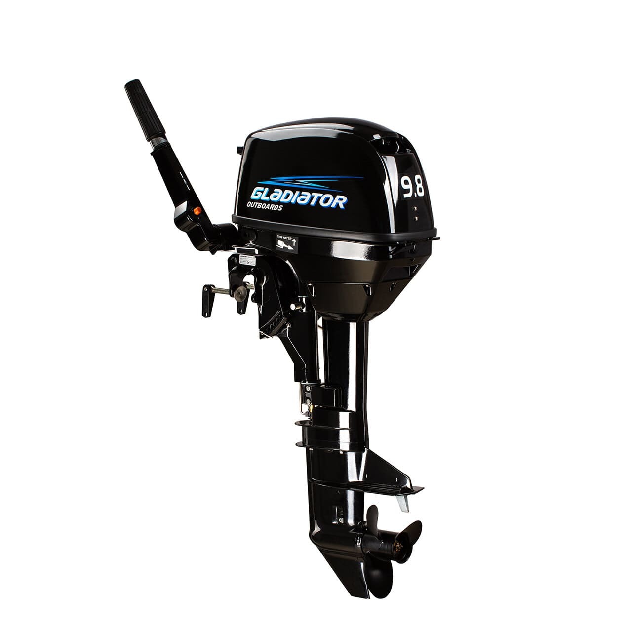 Лодочный мотор Gladiator G9.8 FHS запускается вручную, управляется при помощи румпеля и имеет водяное охлаждение. Данный двухтактный двухцилиндровый двигатель с рабочим объемом 169 см3 и мощностью в 9.8 л.с. оснащен выносным топливным баком на 12 литров. В среднем расход топлива составляет 4 л/ч. Из достоинств модели можно отметить бесшумность работы, увеличенный ресурс, высокую устойчивость к коррозии и простоту обслуживания.