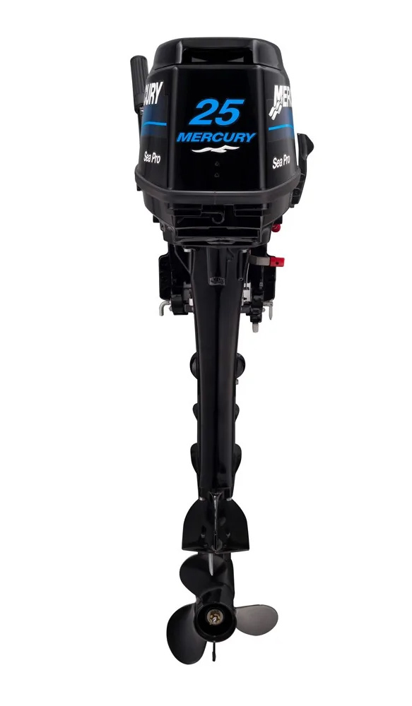 Мотор серии Sea Pro - выносливый, мощный и неприхотливый. Фактически мотор Меркури 25 Sea Pro, аналог мотора Меркури 30, дефорсирован путем установки прокладки в карбюраторе. Смысл дефорсирования - работа мотора на максимальных оборотах становится намного экономичнее в плане топлива и существенно увеличивается ресурс мотора. Его можно использовать как для повседневной жизни - отдыха, рыбалки, так и в коммерческом использовании, в тяжелых условиях работы. Mercury 25 Sea Pro имеет классическую систему управления - газ на румпеле, переключение передач на корпусе мотора. Он легко переделывается в дистанционный вариант и имеет в дополнительном оборудовании возможность установить выпрямитель и запитать бортовую систему лодки или катера от работающего двигателя.