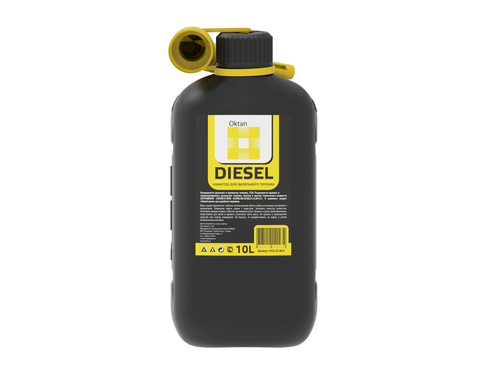 Специальная канистра для дизельного топлива, других видов ГСМ и технических жидкостей. Канистра снабжена крышкой с замком и гибким заправочным носиком для удобной заливки топлива горловину бака транспортного средства. Объем: 10л.