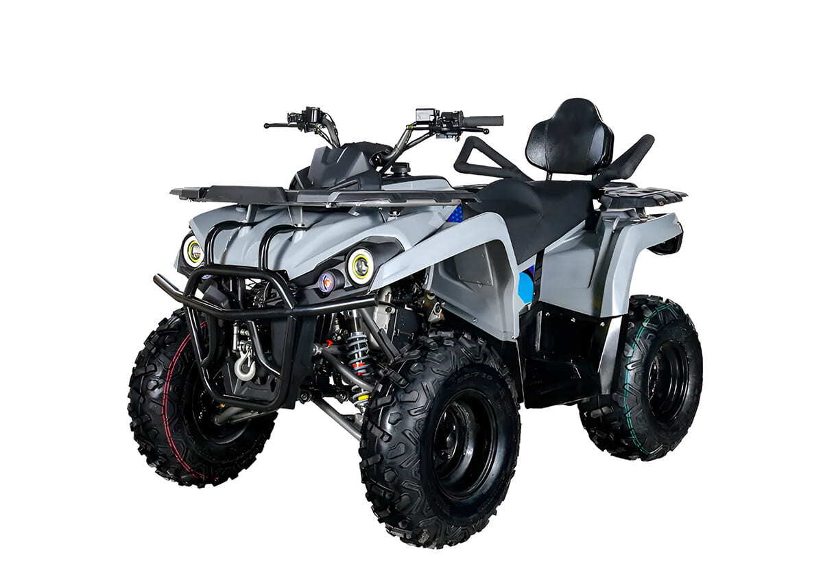 Квадроцикл оснащён четырёхтактным двигателем Juneng 163QMK с балансирным валом. Крепление мотора через сайлентблоки снижает вибрации и повышает комфорт при движении по неровной местности. Для удобства управления задний тормоз вынесен на руль — это освобождает пространство для ног и исключает риск случайного нажатия на педаль на сложных участках.