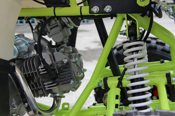 Квадроцикл Iride KOKS 125 кубов выделяется ярким дизайном. Современная оптика, в сочетании с высококачественным пластиком и накладками на колеса в цвет бамперов не оставят равнодушными как детей, так и взрослых. Мотовездеход оборудован гидравлическими передними и задними тормозами, что в совокупности с усиленной рамой и мощным двигателем прекрасно подойдет для подрастающих любителей бездорожья. Автоматическая коробка с центробежным сцепление имеет три передачи: вперед, нейтраль и задний ход. Комплект запчастей IRIDE KOKS 125 8