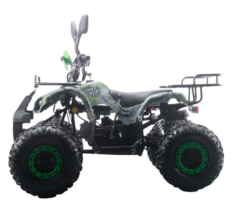 ATV Motax Grizlik 8 125 — подростковый квадроцикл в утилитарном дизайне, на больших 8-дюймовых колёсах с хорошими грунтозацепами. Подходит для детей и подростков от 6 до 16 лет. Квадроцикл оборудован тяговитым 4-х тактным двигателем, бесступенчатой полуавтоматической трансмиссией с одной передачей вперёд и передачей заднего хода. Также квадроцикл имеет богатую базовую комплектацию: он оборудован электрическим стартером, пультом дистанционного глушения и запуска двигателя, механическим ограничителем скорости, усиленным передним и задним багажником, ножным гидравлическим задним тормозом, передним барабанным и стояночным тормозом, комфортными гидравлическими амортизаторами, яркими передними светодиодными фарами и светодиодным задним фонарем со стоп сигналом, электронной панелью приборов с функцией спидометра, тахометра и счетчиком пройденного пути, металлическим топливным баком, усиленной 428 приводной цепью. Передняя подвеска на независимых рычагах со съемными шаровыми опорами, что делает его очень комфортным и ремонтопригодным. Комплект запчастей MOTAX ATV Grizlik-8 125