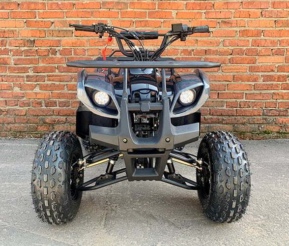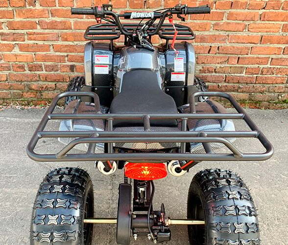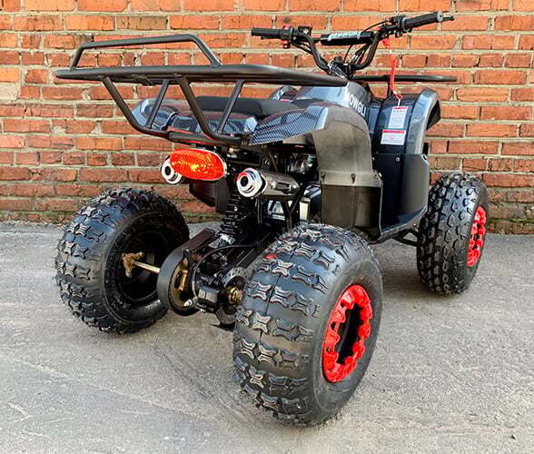 Квадроцикл оборудован мощным бензиновым четырехтактным двигателем на 49 кубических сантиметров, конструкция выдерживает нагрузку до 120 кг. Диаметр колес 8 дюймов, они идеально приспособлены для передвижения по грунтовым дорогам, песку или траве.