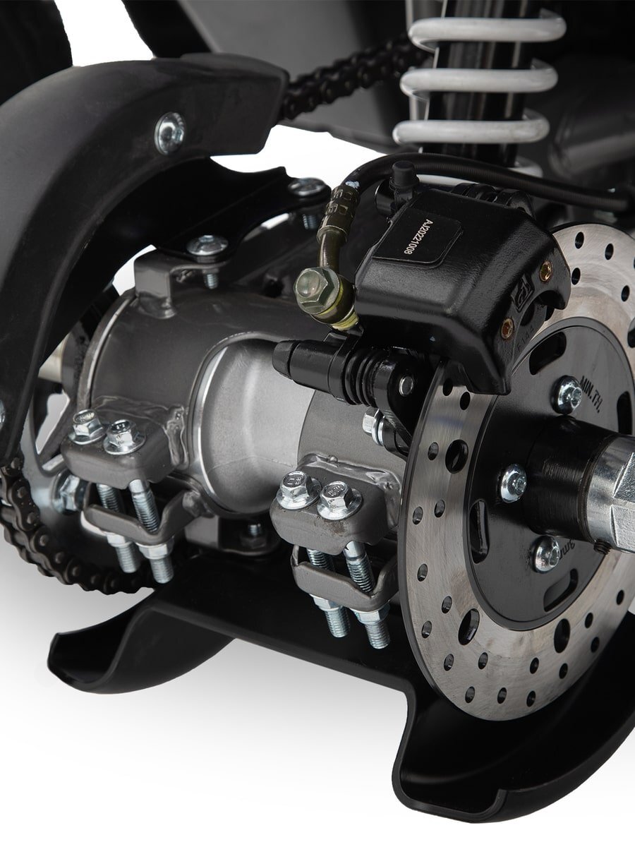 Привод на заднюю ось осуществляется при помощи усиленной цепи, что позволяет быстро и без больших потерь передавать всю мощность двигателя на колёса. Передние двухпоршневые суппорты обеспечивают серьёзную безопасность райдера и большую уверенность в торможении.