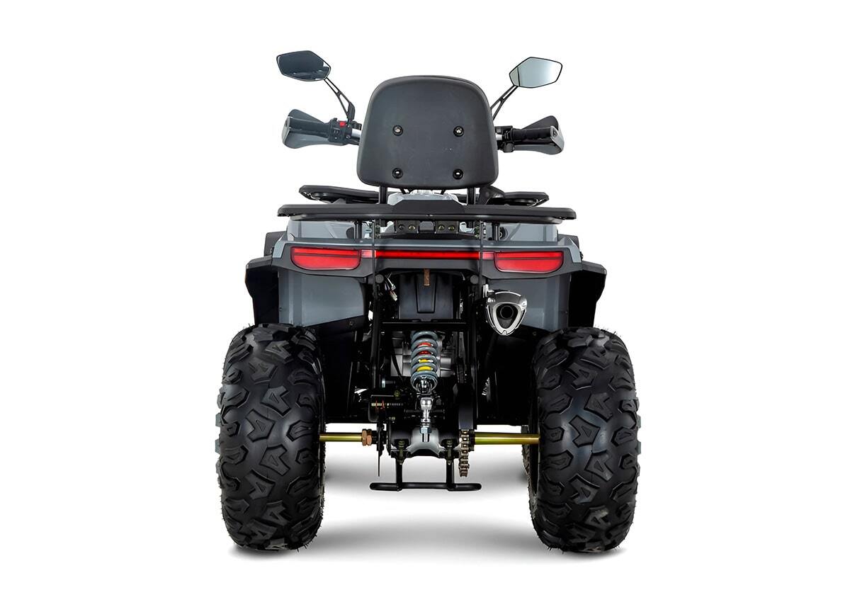 Квадроцикл оснащен одноцилиндровым четырехтактным бензиновым двигателем объемом 200 куб. см, мощность которого составляет 17 л.с. Это позволяет развивать максимальную скорость до 70 км/ч, а также уверенно преодолевать различные типы местности. Благодаря балансировочному валу двигатель работает плавно, значительно снижая вибрацию, что повышает комфорт езды.