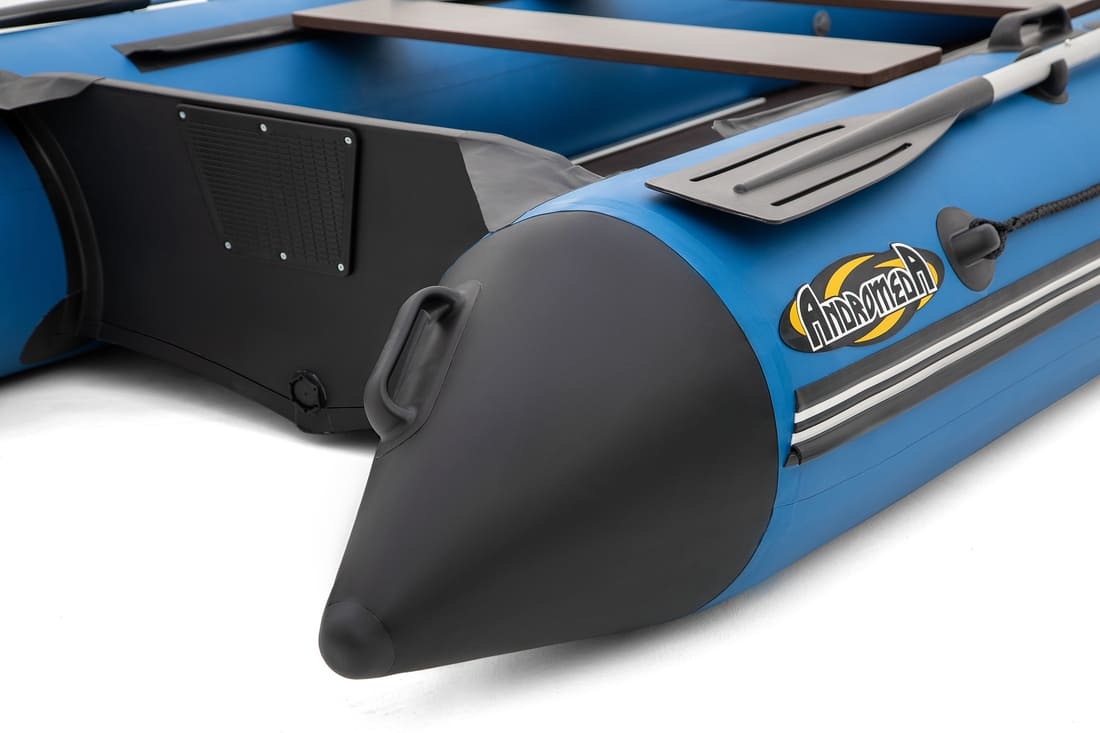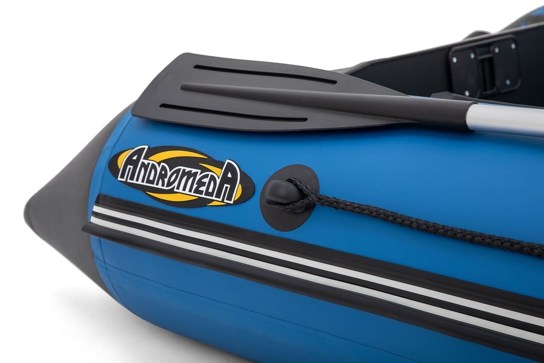 В изделии применены все самые лучшие технические и технологические достижения, которые позволяют лодке развивать высокую скорость и обладать отличной маневренностью и управляемостью, обеспечивать высокую остойчивость и другие характеристики, что в целом отвечает самым высоким критериям надежности и безопасности. Весь модельный ряд лодок «Андромеда (Andromeda)» оснащается высококачественной фурнитурой собственного производства. Ручки, шайбы, пластиковые элементы весла и поворотной уключины, фиксаторы сидений, держатели транца и концевики баллона разрабатывались специально для условий повышенных нагрузок, имеют хорошие показатели испытаний на разрыв и излом.