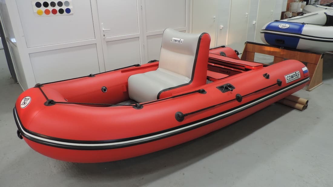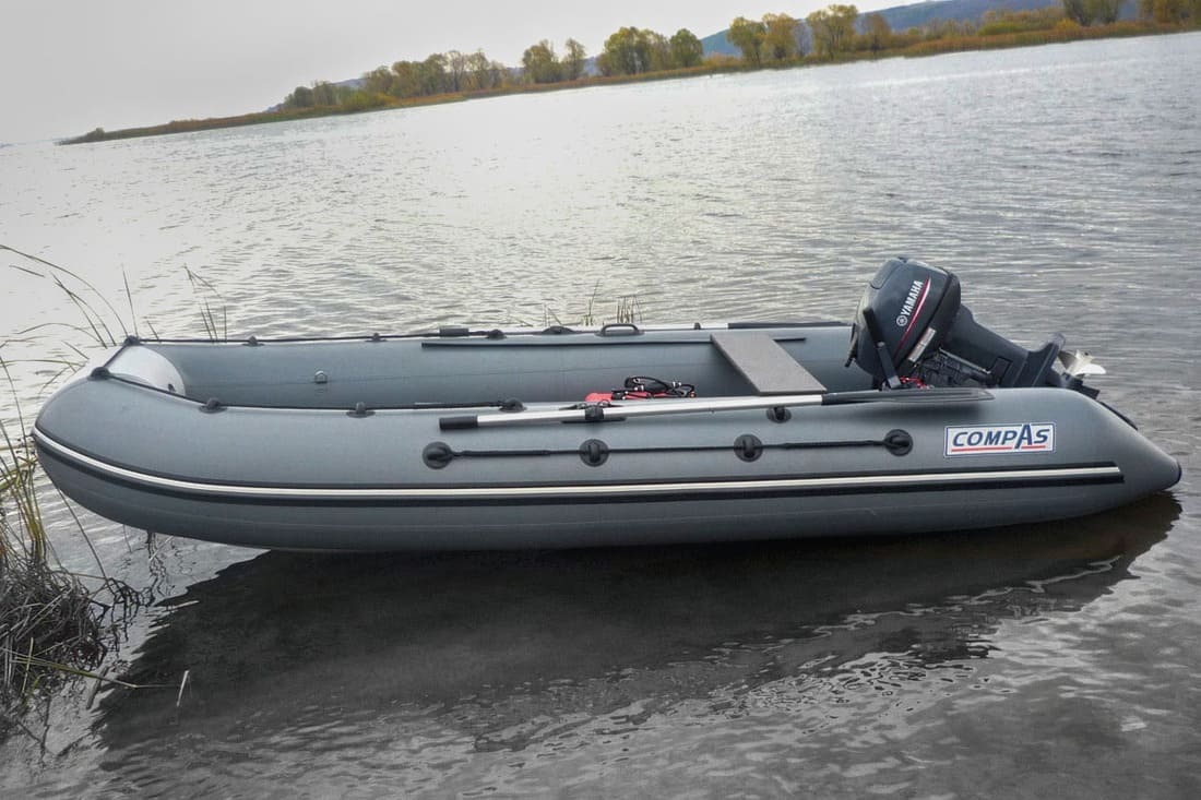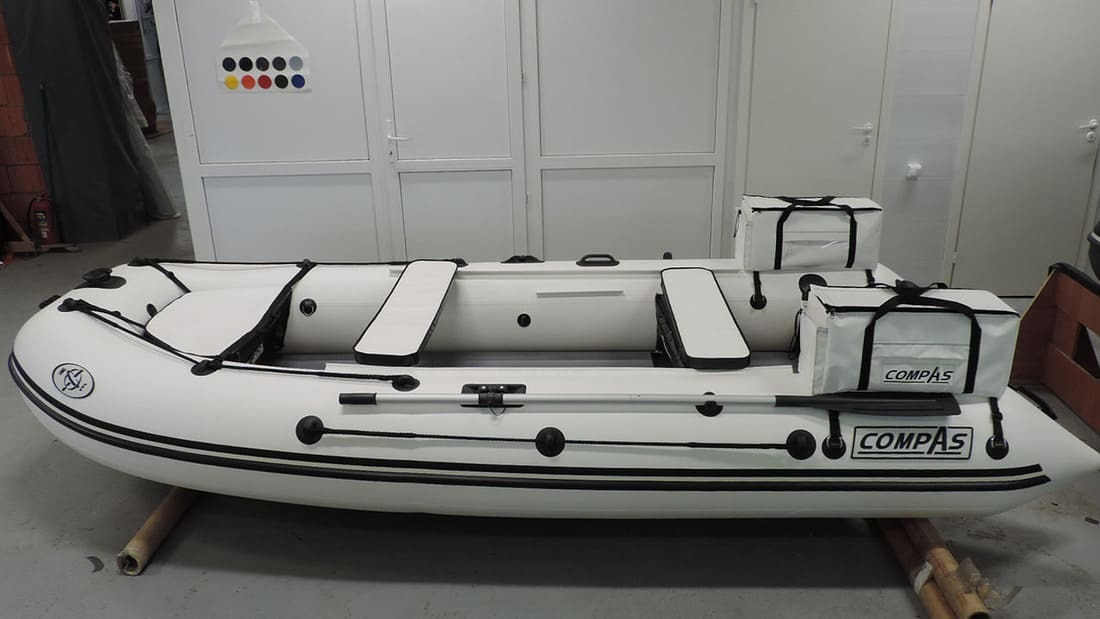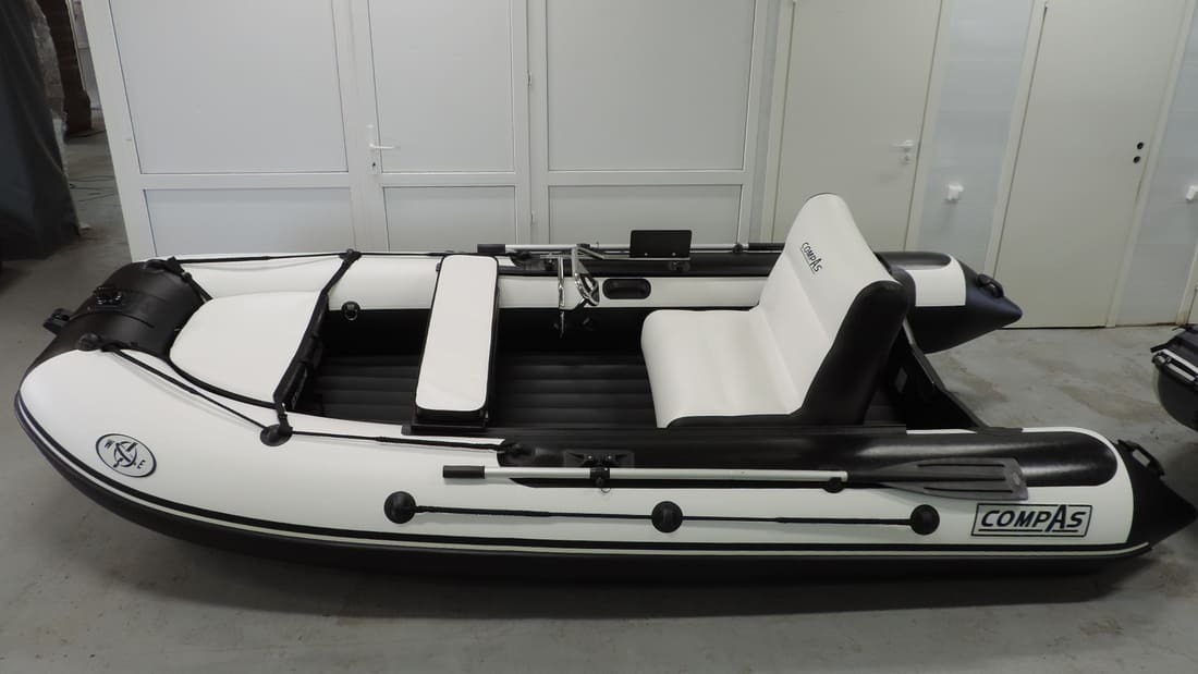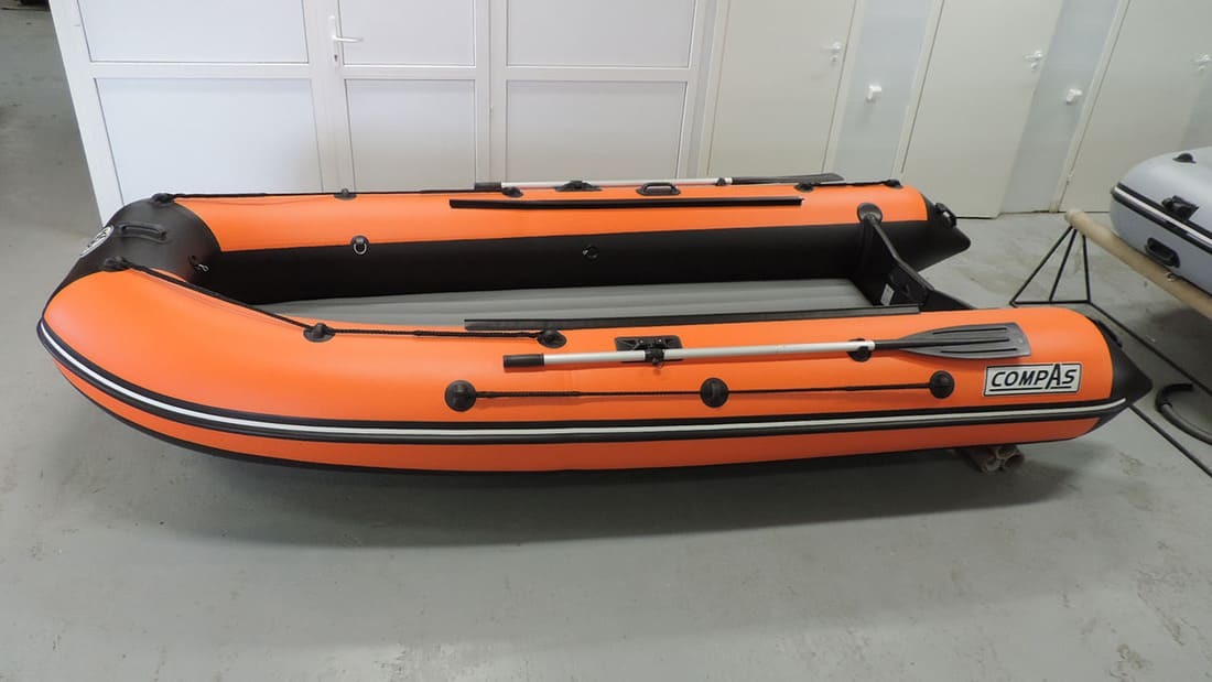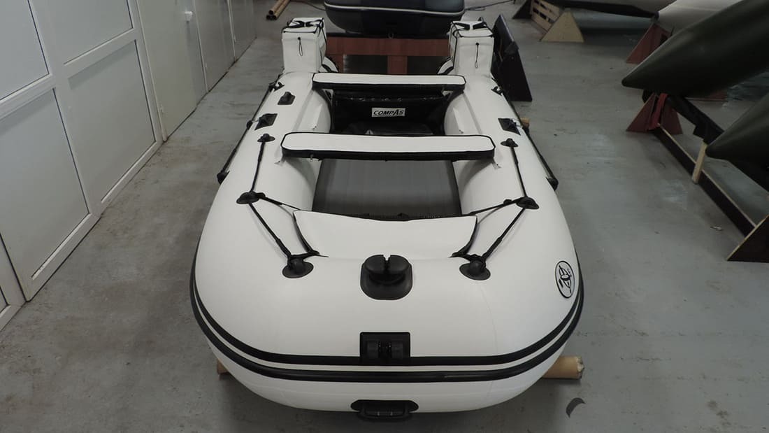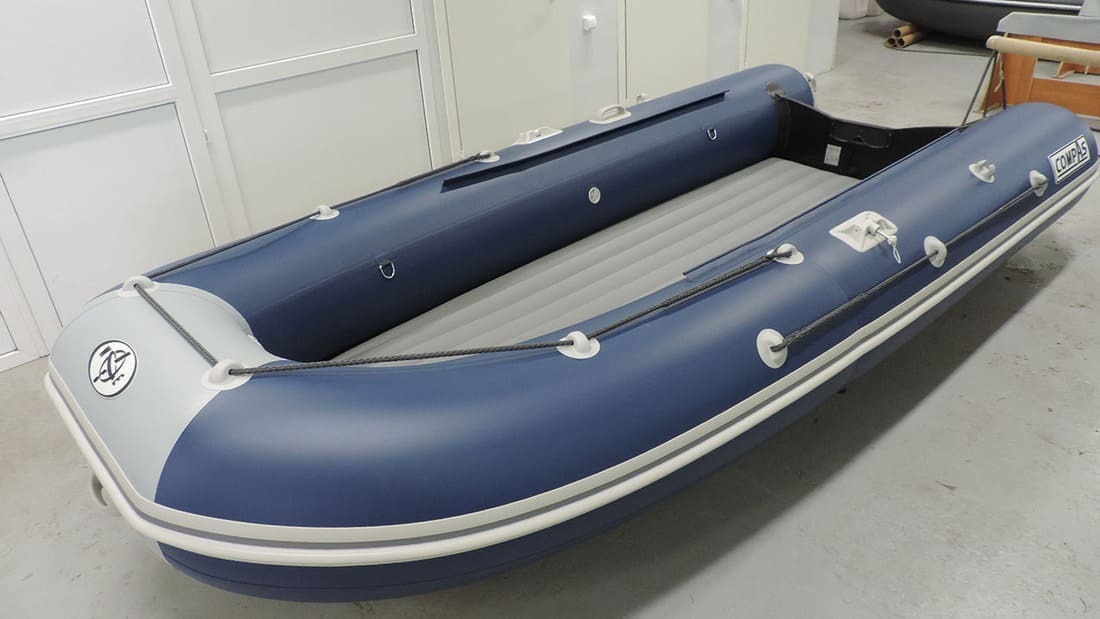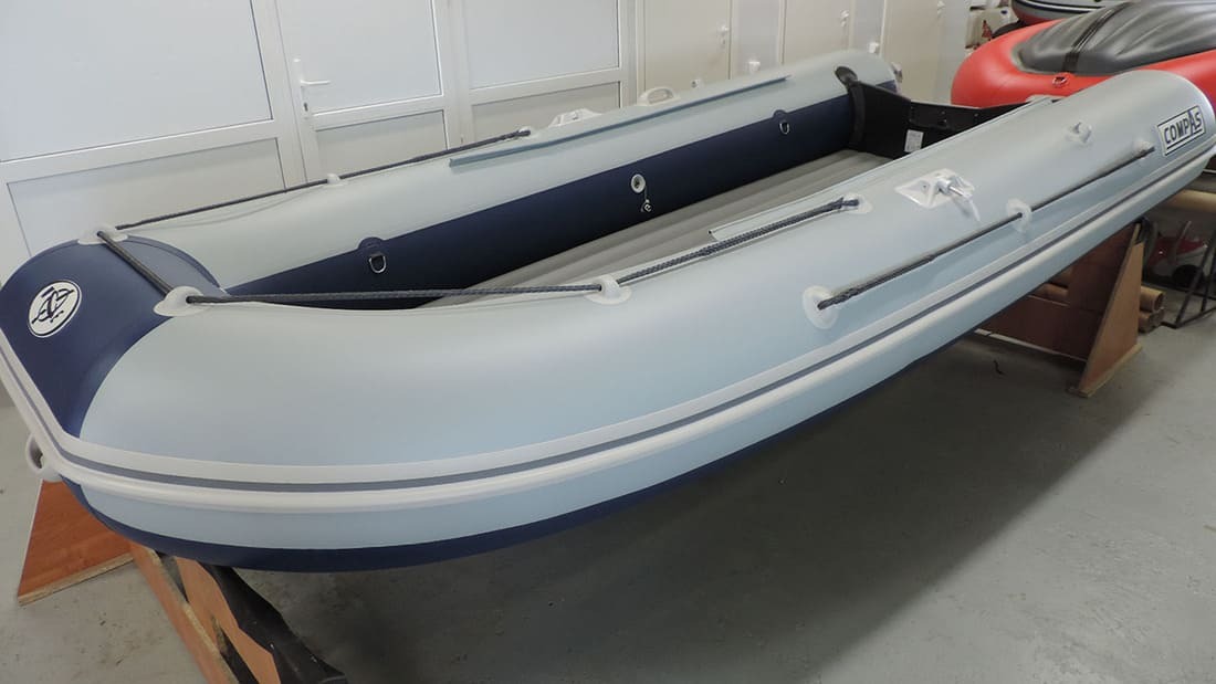 Лодка Compas 400 с надувным дном низкого давления (нднд) с заданной килеватостью. Способ крепления надувного дна к баллонам исключает взаимный износ и запатентован.