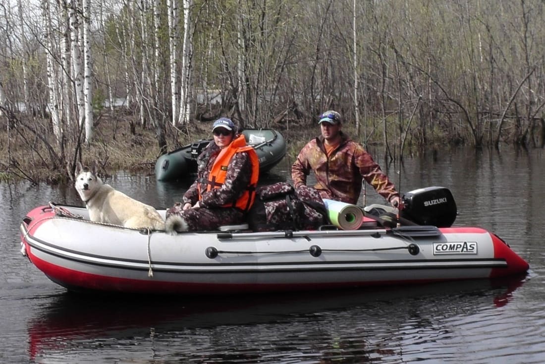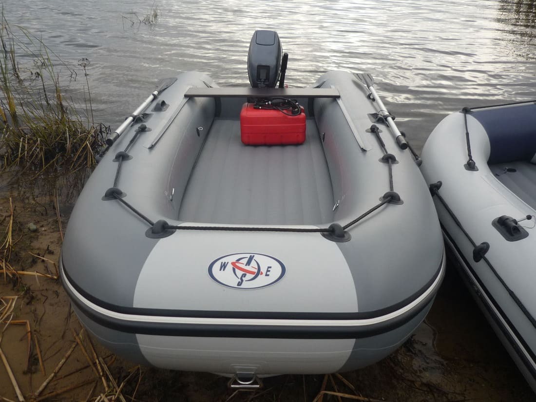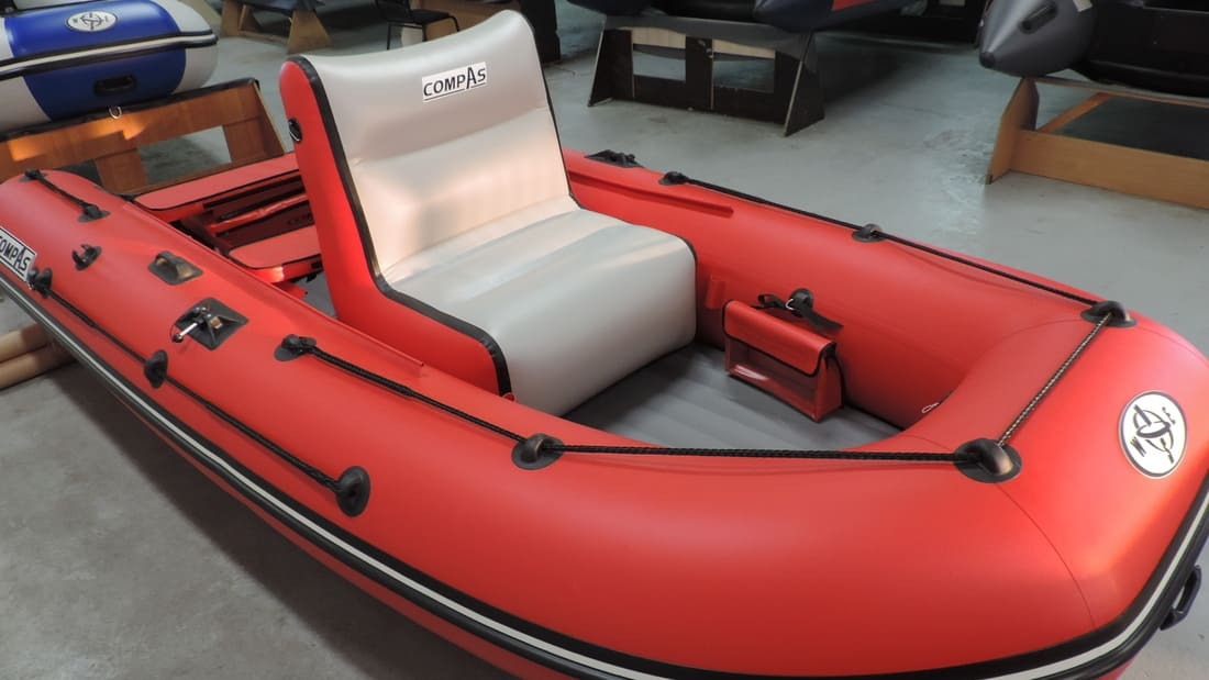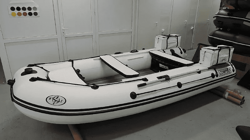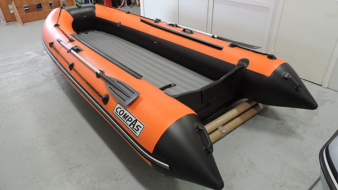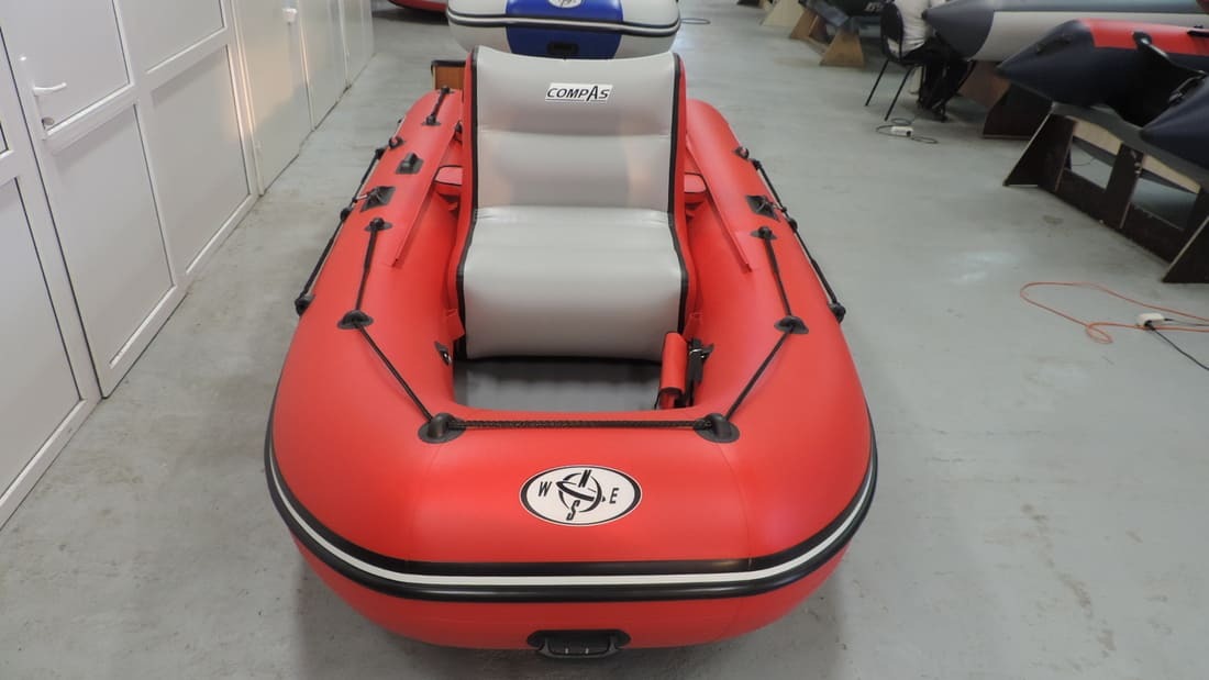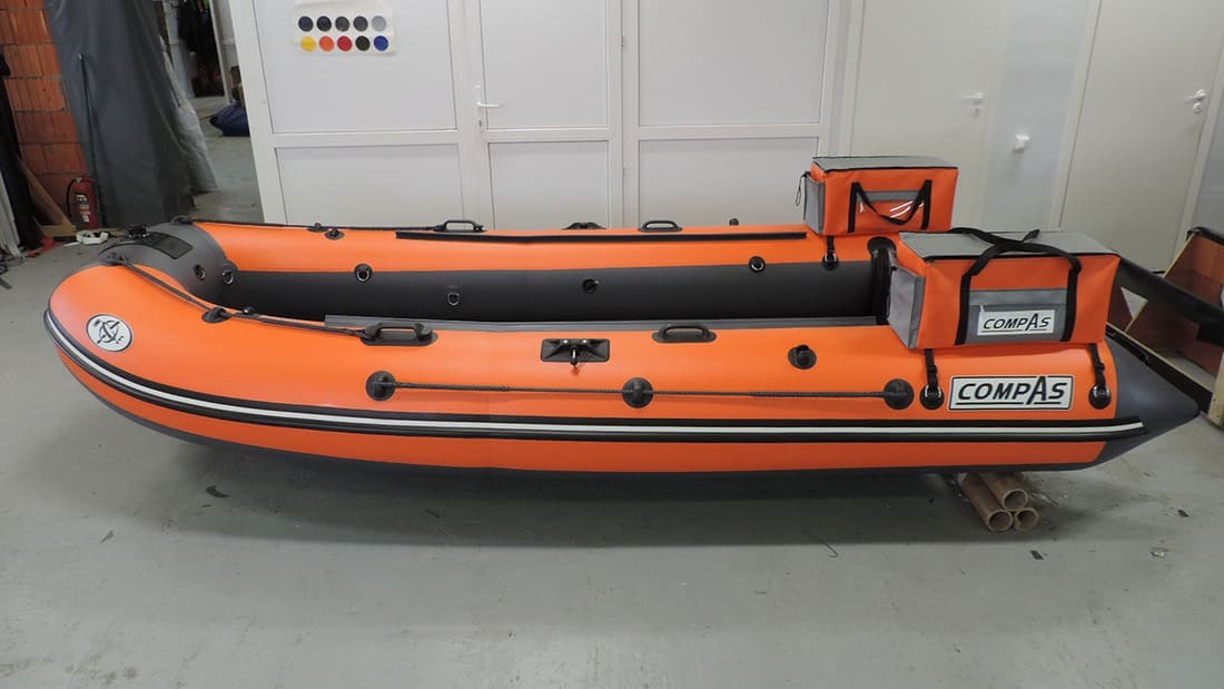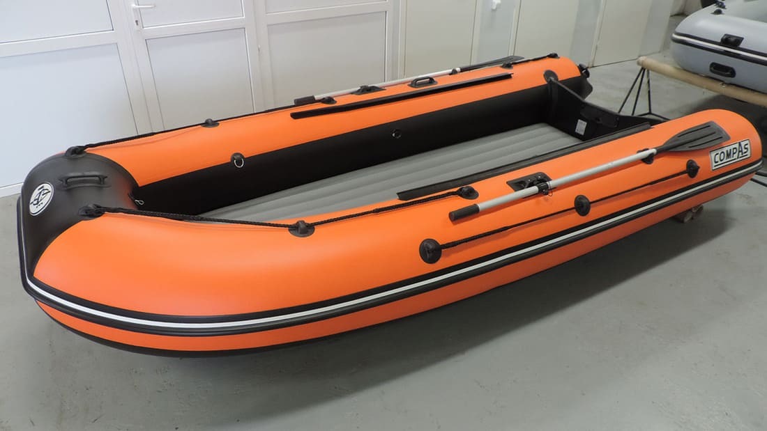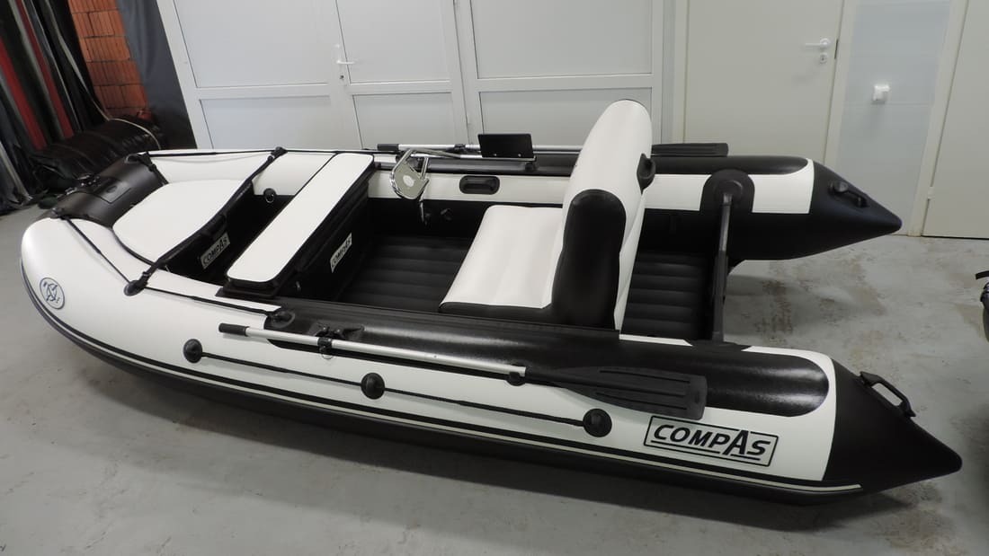 Лодка Compas 400 с надувным дном низкого давления (нднд) с заданной килеватостью. Способ крепления надувного дна к баллонам исключает взаимный износ и запатентован.