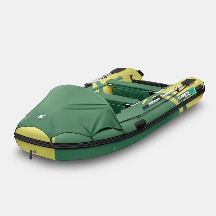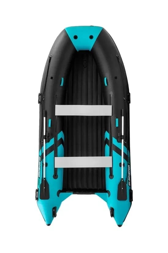 Лодка Gladiator E380 - имеет объемное надувное дно низкого давления НДНД, вклеенное в нос и борта, которое надувается в считанные минуты. Все наиболее уязвимые места нижней части лодки (киль и баллоны) усилены броней из 5 мм полиуретановой ленты (ширина брони по килю - 8см, по баллонам - 20 см). Стационарный транец из высококачественной влагостойкой ламинированной фанеры марки ФСФ российского производства (толщина 27 мм) под мотор 30 л.с. располагается на подушке, которая предохраняет его при столкновении с каменистым дном или большими валунами на дне реки.