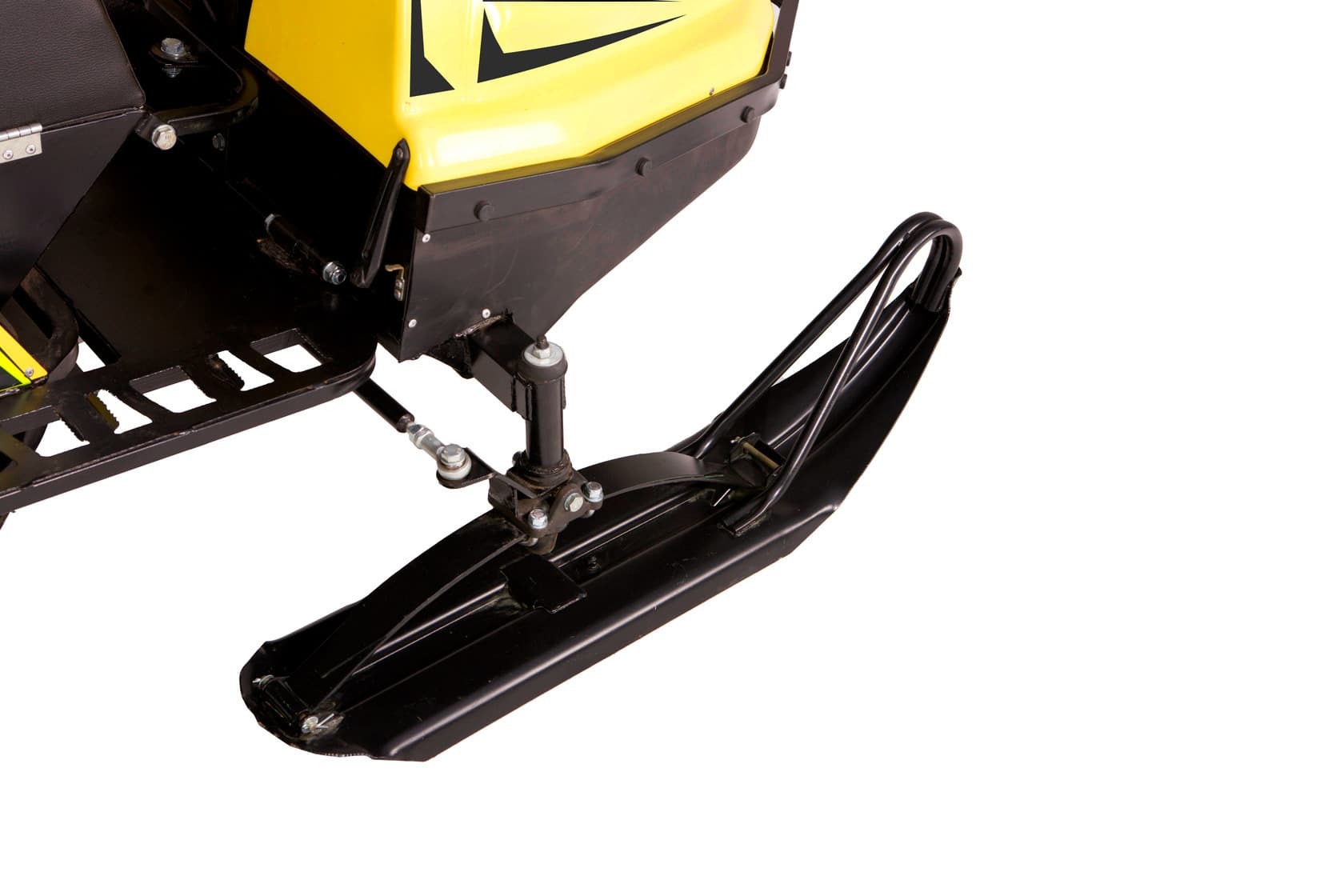 Одноименный двигатель Sharmax на 20 л. с. и карбюратор Mikuni позволяют с лёгкостью достигать скоростей до 60 км при расходе 3,75 л/час. Удлинённая гусеница шириной в 500 мм не только даёт возможность с лёгкостью передвигаться в глубоком снегу, но демонстрирует отличный зацеп на любых покрытиях. Тележка сделана из цельного листа металла с усилителями внутри, что позволило сделать конструкцию максимально прочной и надежной. Сиденье рассчитано на двух человек. Большая система хранения, большой рундук под сиденьем, также есть большое пространство под капотом мини-снегохода (прицепное устройство поможет расширить его с помощью саней-волокуш). Металлические лыжи с рессорной подвеской дают уверенность в конструкции.