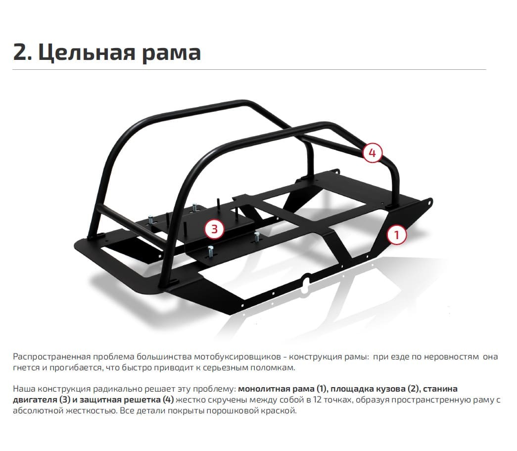 На транспорте установлен монолитный руль, обеспечивающий более прочное и надежное соединение с механизмами мотобуксировщика (например, с барашками и шплинтами). Это способствует жесткости и надежности оборудования, особенно важно это в условиях повышенной нагрузки. Крепление руля находится на уровне гусеницы, что устраняет вероятность опрокидывания буксировщика на бок.