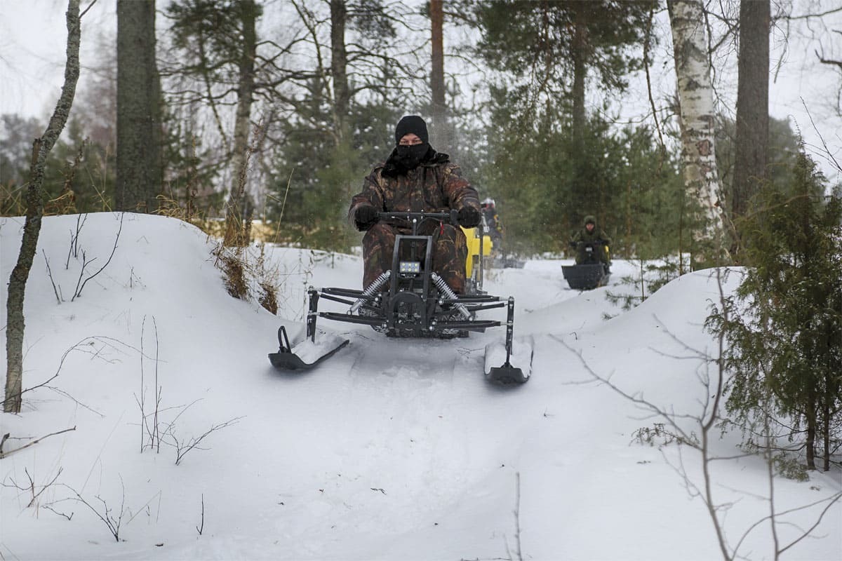 В конструкции мотовездехода используется цельная резиновая гусеница Composit шириной 500 мм. Гусеница в сочетании с катковой подвеской способна проходить спокойно по льду и даже по территории без снега.