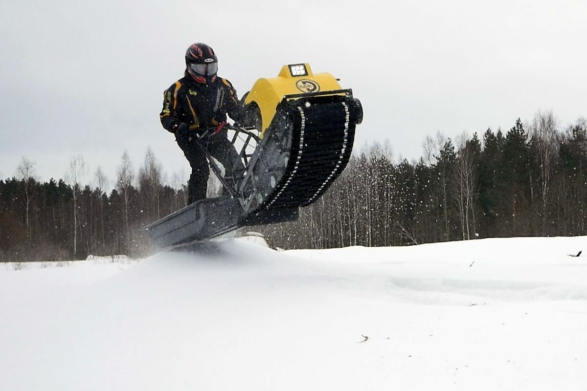 В конструкции мотовездехода используется цельная резиновая гусеница шириной 500 мм. Гусеница в сочетании с катковой подвеской способна проходить спокойно по льду и даже по территории без снега.