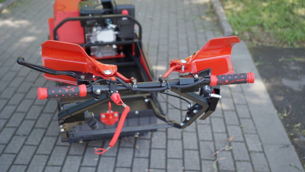Мотособака весит 100 кг, а габаритные размеры ДШВ по крайним точкам составляют: 1450х680х810 мм. Управление не требует особых усилий, поэтому справиться с ним можно даже если у вас нет опыта.