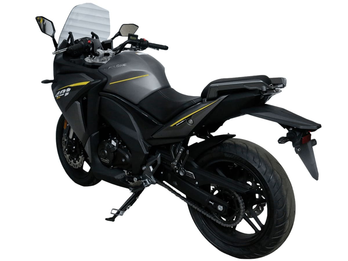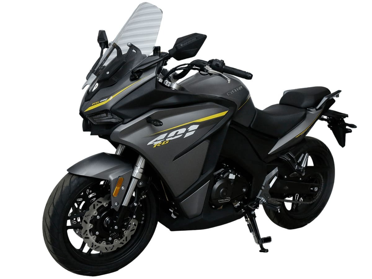 CYCLONE RG401 (SR400GS-B) – турист для покорения самых непростых и протяжённых маршрутов. Он обладает стремительным и современным дизайном в лучших “традициях жанра” туристических мотоциклов. В качестве силовой установки выступает рядный двухцилиндровый четырёхтактный двигатель объёмом 401 см3 , который выдаёт 45 л.с. на 9500 об/мин. Максимальный крутящий момент достигается на 8000 об/мин и составляет 37 Н·м. Инжекторный впрыск топлива с блоком управления BOSCH увеличивает топливную экономичность, а также позволяет добиться высокой приёмистости и неприхотливости агрегата. Жидкостная система охлаждения не допустит перегрева двигателя даже на самых непростых маршрутах. На мотоцикл установлена 6-ступенчатая механическая коробка передач. Максимальная скорость мотоцикла составляет 155 км/ч. Мотоцикл оснащён литыми алюминиевыми дисками диаметром 17 дюймов. Колёса обуты в бескамерные покрышки TIMSUN. С неровностями дороги эффективно справляются телескопическая вилка перевёрнутого типа спереди и маятник с моноамортизатором сзади. Ход передней подвески составляет 120 мм, задней – 55 мм. Оба компонента подвески являются регулируемыми. Эффективное и безопасное замедление с любых скоростей обеспечивают гидравлические дисковые тормоза с двухканальной системой ABS спереди и сзади. Клиренс мотоцикла составляет 155 мм. Объём топливного бака – 21 л. Снаряжённая масса – 213 кг. Модель имеет два видеорегистратора, механическую регулировку ветрового стекла, датчики давления в шинах, подсветка пультов и два USB-порта. При желании можно оснастить мотоцикл двумя боковыми кофрами. CYCLONE RG401 (SR400GS-B) сочетает в себе отличные технические характеристики, комфорт и надёжность, что позволяет вам ощутить настоящую свободу на любой дороге.