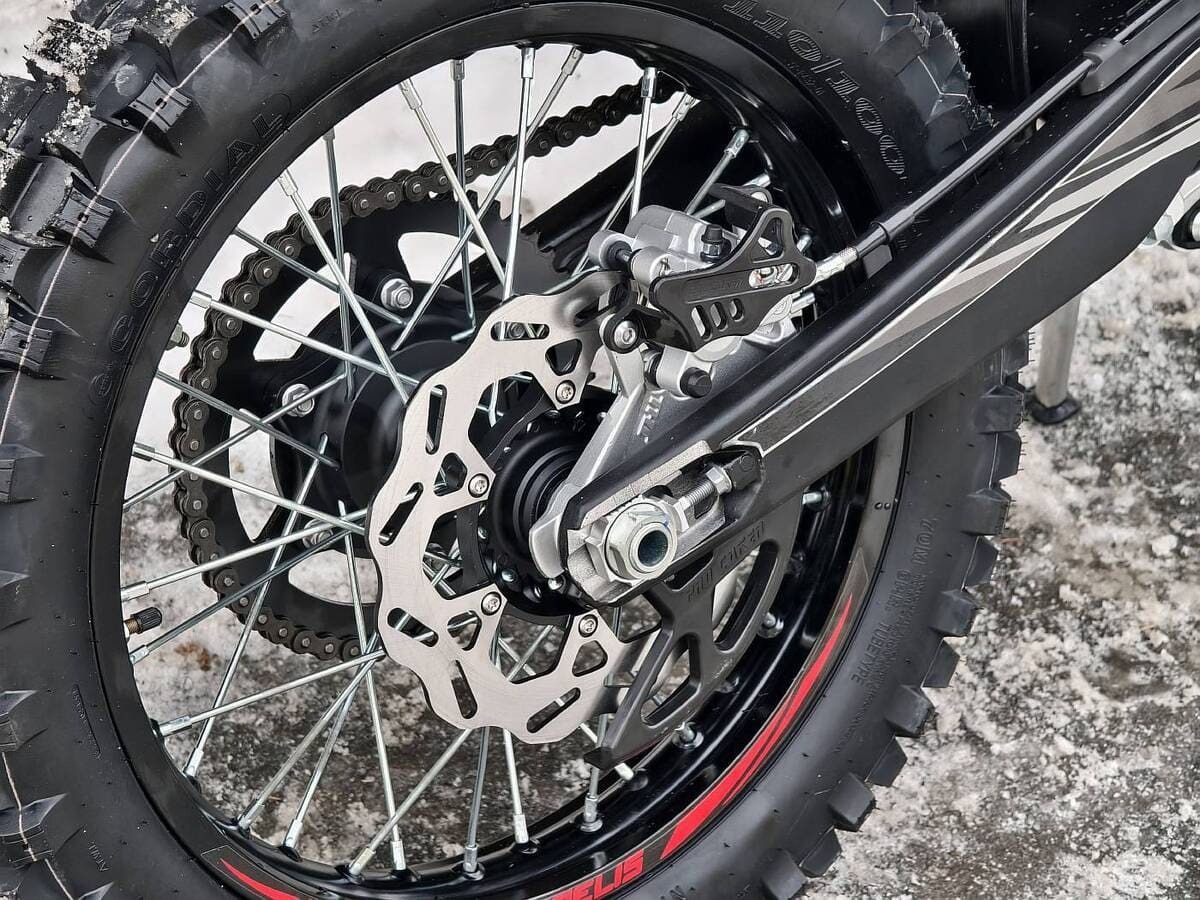 Подвеска — отдельная гордость модели: передняя KKE перевёрнутого типа, полностью регулируемая (ход 270 мм, диаметр 47 мм), задняя — с бачком, настройками, и ходом 110 мм. В паре они дают ощущение полной управляемости даже на самом жёстком покрытии. Дисковые тормоза, усиленная цепь AFAM A520MC2, надёжная резина CHAOYANG — всё готово к бою.