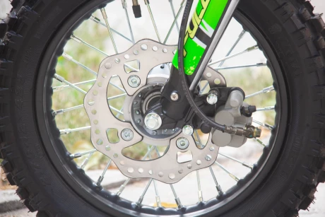 Весом всего 65 кг, передние шины на 12 дюймов, задние на 10, спицованные колесные диски, автоматическое сцепление с четырьмя скоростями, гидравлическая тормозная система, маятниковая подвеска, карбюратор Jink Ke 22мм с обогатителем, короткоходная ручка газа, датчик моточасов, подножки для водителя, запуск двигателя возможен как с электростратера, так и с кик, защитная экипировка яркого цвета делает эту модель привлекательной и достойной внимания.