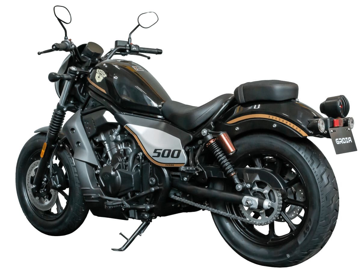 GROZA XS500 – лёгкий круизёр, который подойдёт как для перемещения как в городе, так и за его чертой. Его отличает энергичный силуэт, комфортная посадка и отсутствие лобового стекла. В дизайне присутствует множество олдскульных элементов, таких как фонари в отдельных корпусах, резиновые гофры на перьях вилки и изящная графика на обтекателях. При этом многие детали и узлы пришли из мира современных мотоциклов: рядный двухцилиндровый двигатель жидкостного охлаждения, мультимедийная приборная панель, чёрные литые диски, выносные бачки задних амортизаторов медного оттенка, глушитель современного вида и светодиодная оптика по последнему слову техники. Органичное сочетание технологичных и ретро-элементов рождают уникальный коктейль из стиля, практичности и высокой эффективности на дороге.