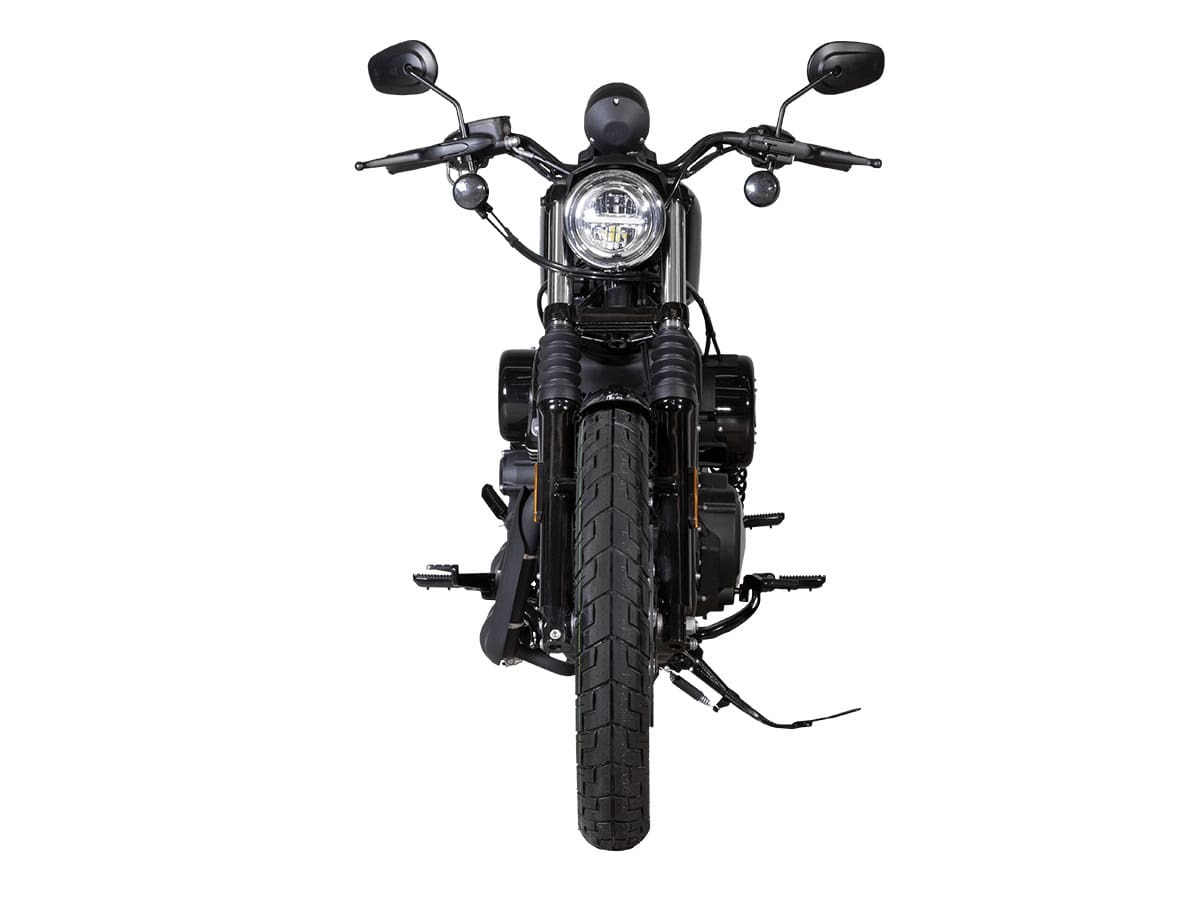 GROZA XS650 – минималистичный и брутальный круизёр, созданный для тех, кто не против рискнуть, но всегда делает это спокойно и уверенно. Минимум обтекателей, минимум сверкающих хромированных деталей, лаконичный компактный бак, литые чёрные диски, очень низкий и узкий руль, полное отсутствие лобового стекла и фара, которая только на первый взгляд напоминает ретро, на самом деле скрывая мощный и современный светодиодный блок. Выхлопная система с двумя параллельными воронёными глушителями имеет весьма оружейный вид.