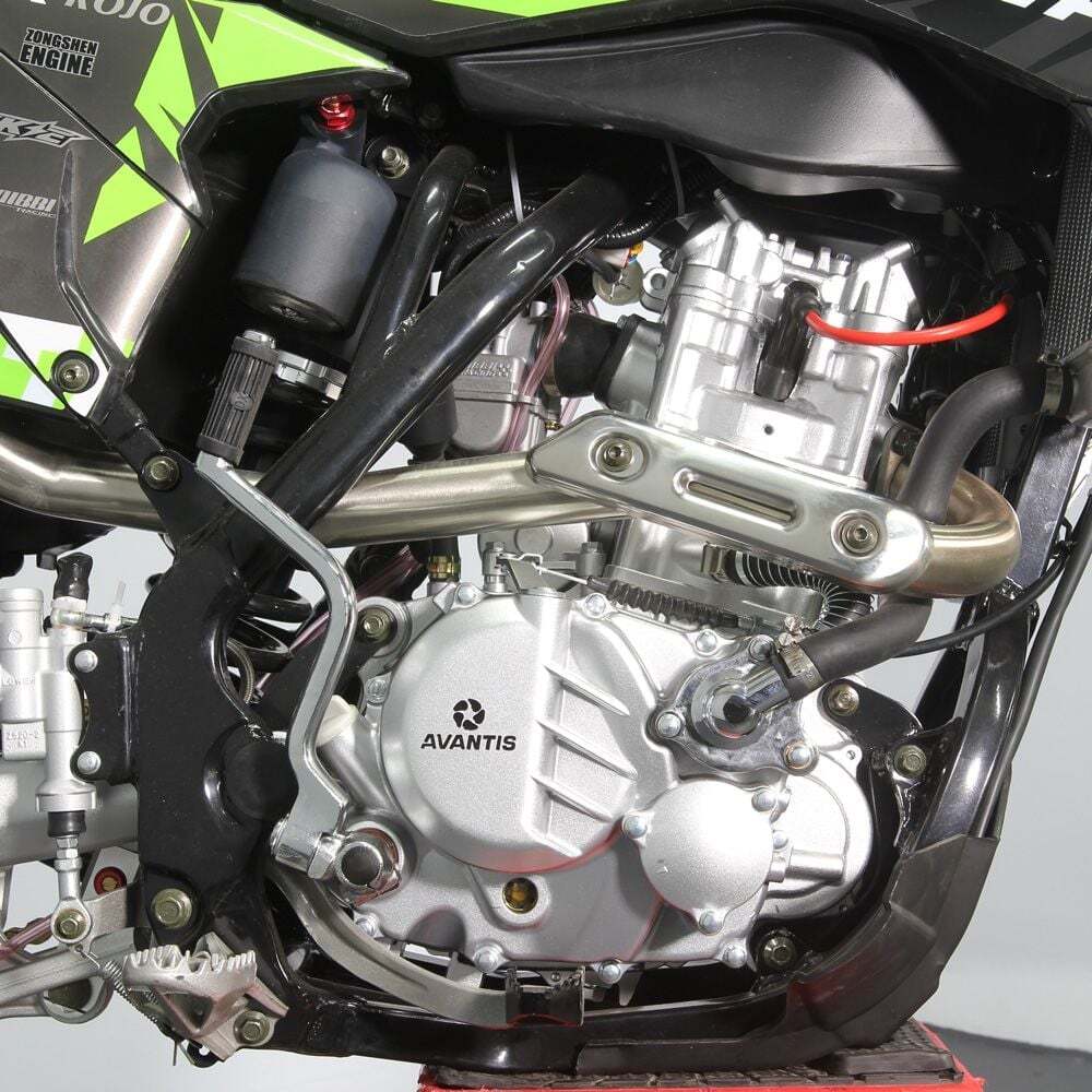 Комплектация Avantis A7 Lux отличается регулируемой подвеской, жесткость которой легко настроить в зависимости от особенностей планируемого маршрута. Благодаря отзывчивости двигателя ZongShen CBS300/174MN-3 и продуманной геометрии рамы, мотоцикл очень легко рулится и позволяет уверенно маневрировать между препятствиями. Так же данная комплектация отличается топливным баком увеличенного размера объемом в 6,5 литров: этого более чем достаточно для одной продолжительной поездки по бездорожью.