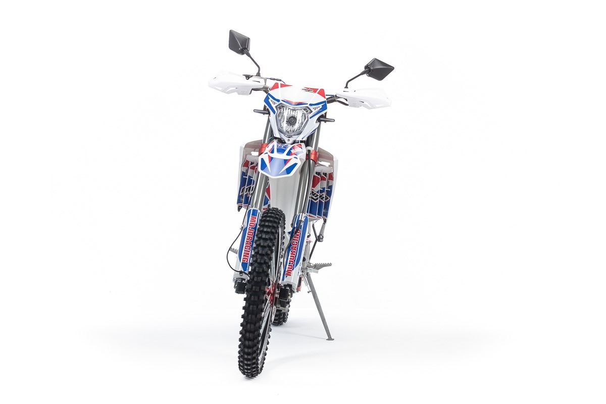 На мотоцикле установлено все необходимое для оффроуда: вилка “перевертыш”, литые рычаги задней прогрессии, алюминиевый маятник, прочный задний бугель, “злая” внедорожная резина. А также: усиленные легкосплавные колёсные диски MOJO, усиленная цепь, защита рук, датчик моточасов, прочные анодированные CNC ступицы, складные СNC рычаги тормоза и сцепления, колесные подшипники NTN, защита коллектора, картера двигателя и тормозных дисков. Комплектуется одинарным либо двойным глушителем. Мощная гидравлическая тормозная система HSК Racing остановит байк в любых условиях.