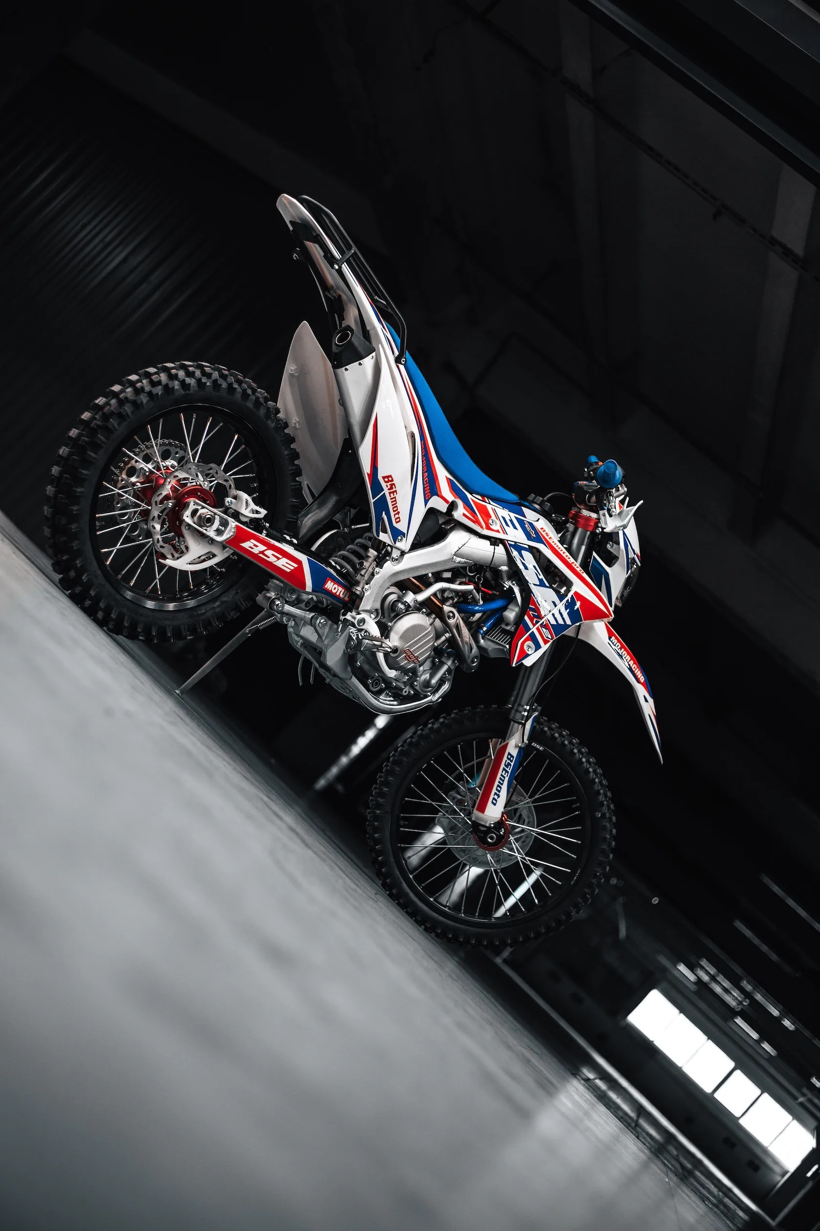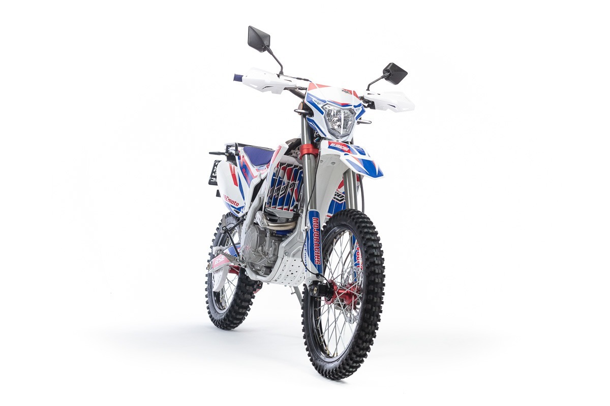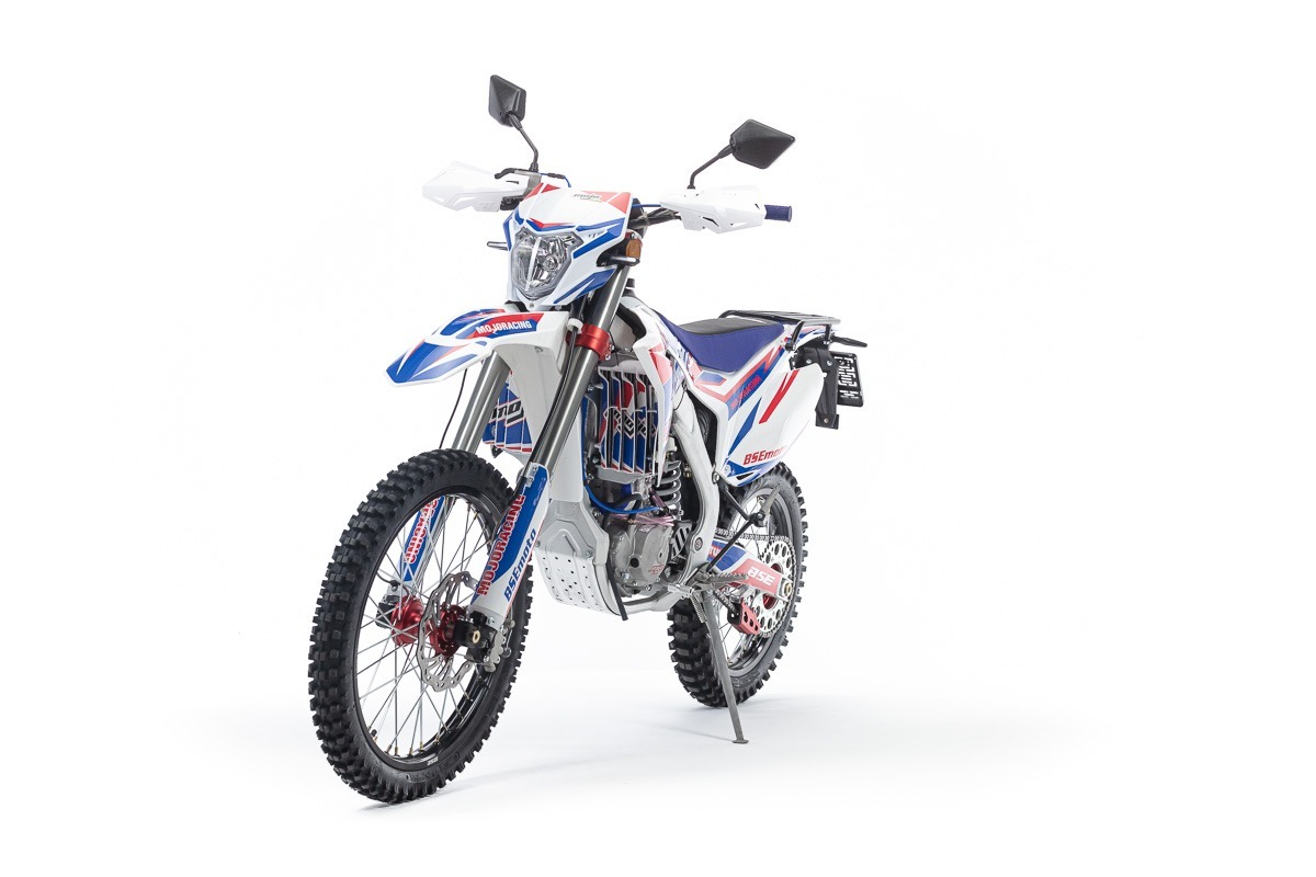 На мотоцикле установлено все необходимое для оффроуда: вилка “перевертыш”, литые рычаги задней прогрессии, алюминиевый маятник, прочный задний бугель, “злая” внедорожная резина. А также: усиленные легкосплавные колёсные диски MOJO, усиленная цепь, защита рук, датчик моточасов, прочные анодированные CNC ступицы, складные СNC рычаги тормоза и сцепления, колесные подшипники NTN, защита коллектора, картера двигателя и тормозных дисков. Комплектуется одинарным либо двойным глушителем. Мощная гидравлическая тормозная система HSК Racing остановит байк в любых условиях.
