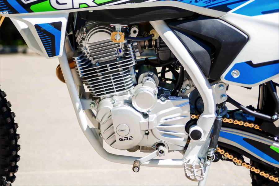 Мотоцикл среднеразмерный, высокий, но не слишком, с полносильным мотором воздушного охлаждения 172FMM, на регулируемой подвеске с прогрессией, уложился в достаточно скромный бюджет. Стальная рама, стальной маятник, карбюратор NIBBI, мегабомб на глушителе, подножки для пассажира, отсутствие буксаторов. счетчик моточасов, короткоходная ручка газа, глушитель из нержавеющей стали, противоскользящая обивка сидения, злая резина - все это GR2 250 Enduro OPTIMUM.