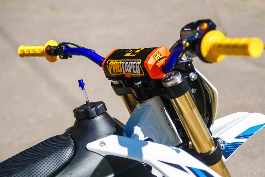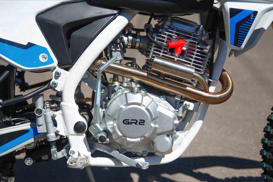 Мотоцикл среднеразмерный, высокий, но не слишком, с полносильным мотором воздушного охлаждения 172FMM, на регулируемой подвеске с прогрессией, уложился в достаточно скромный бюджет. Стальная рама, стальной маятник, карбюратор NIBBI, мегабомб на глушителе, подножки для пассажира, отсутствие буксаторов. счетчик моточасов, короткоходная ручка газа, глушитель из нержавеющей стали, противоскользящая обивка сидения, злая резина - все это GR2 250 Enduro OPTIMUM.