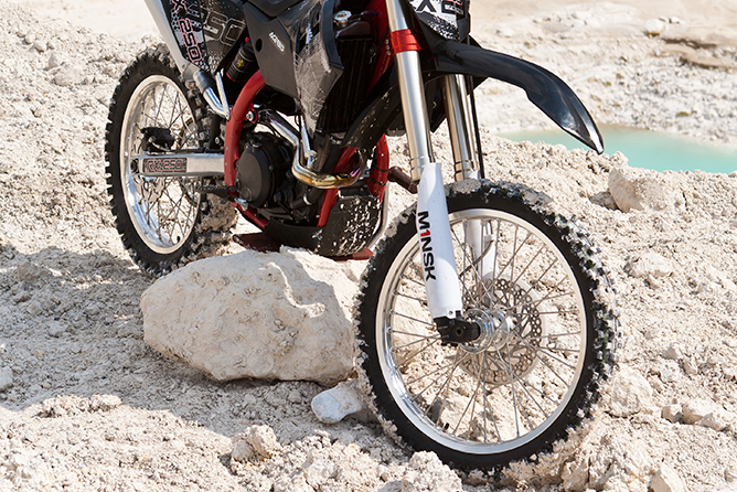 В модели RX 250 использованы комплектующие от ведущих мировых производителей: глушитель Leo Vince, пластик Acerbis, карбюратор Dell’Orto, органы управления Domino, цепь D.I.D., профессиональная подвеска Fast Ace. Переднее колесо имеет размерность 21 дюйм, заднее – 19 дюймов, алюминиевые диски с металлическими спицами.