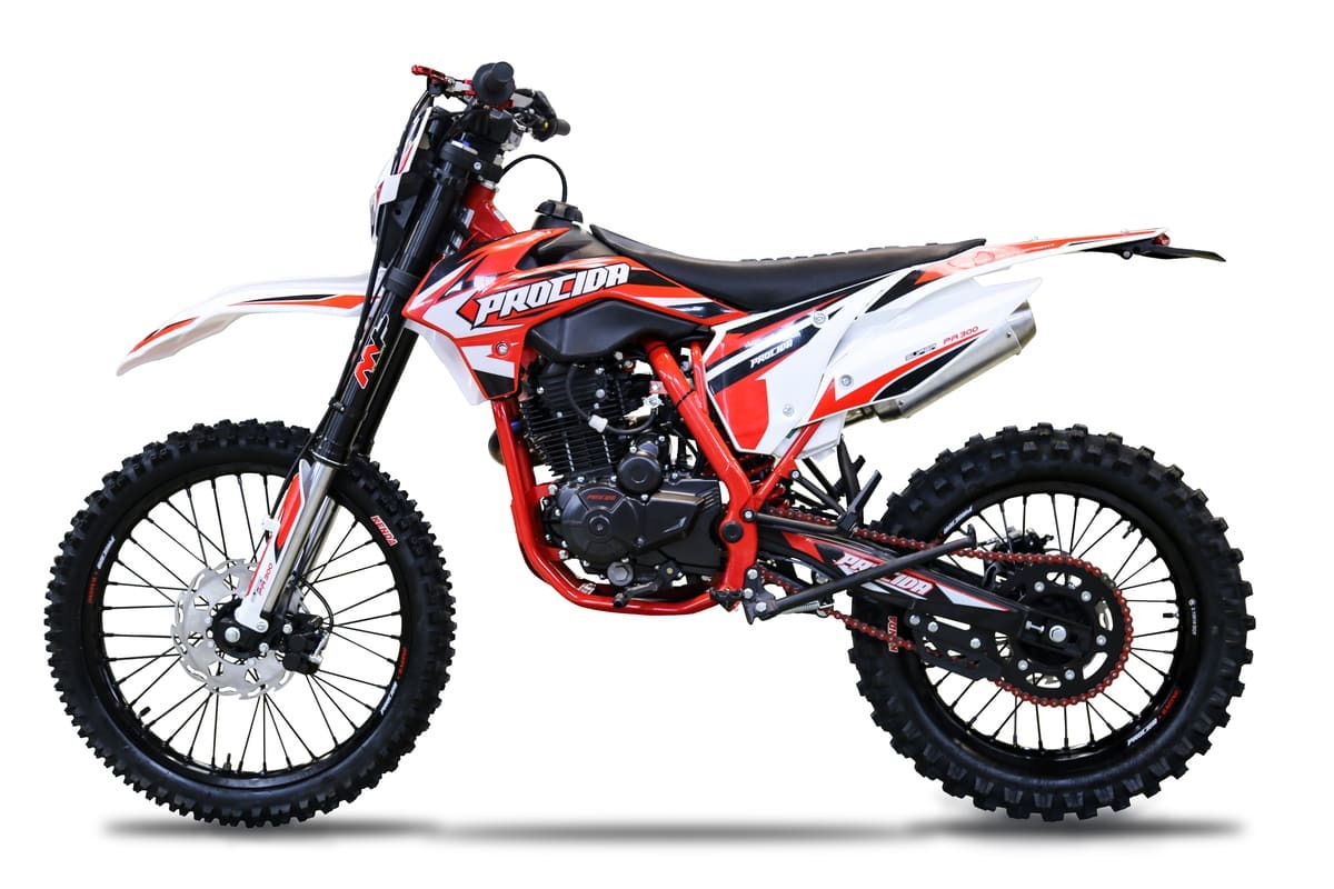 PRÒCIDA K1 PR300 - надежная Эндуро модель для поклонников активного отдыха. Яркий стильный дизайн и надежные рабочие параметры делают эту машину популярным выбором среди любителей мотоспорта. Мотоцикл оснащается четырехтактным одноцилиндровым двигателем с системой воздушного охлаждения и дополнительной защитой. Мотор PR300 (ZS172FMM-5A) имеет мощность 23 л.с. и электрическую систему запуска (кикстартер).