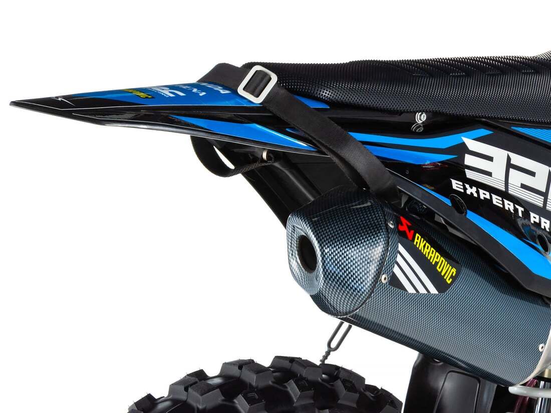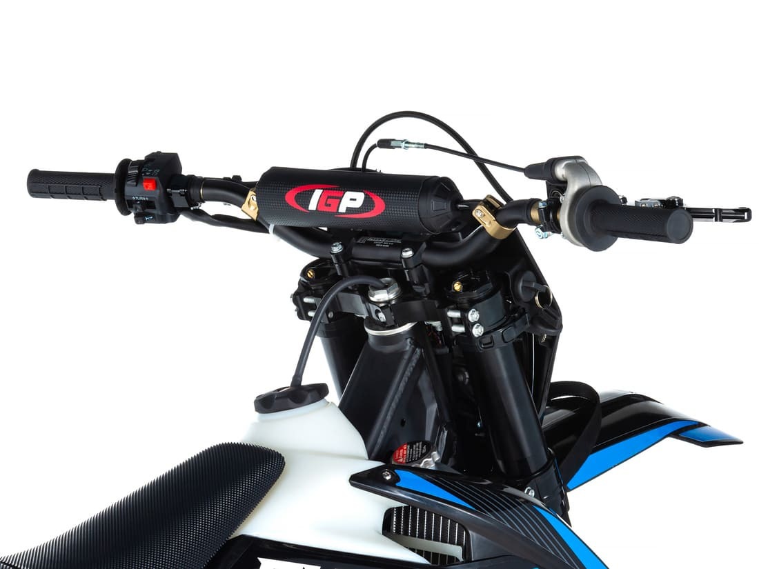 Руль на мотоцикле Expertpro 320 изготовлен из прочного облегчённого алюминиевого сплава по технологии переменного сечения FATBAR. Цепкие грипсы позволяют кистям рук меньше уставать и дозировать открытие заслонки карбюратора максимально точно.