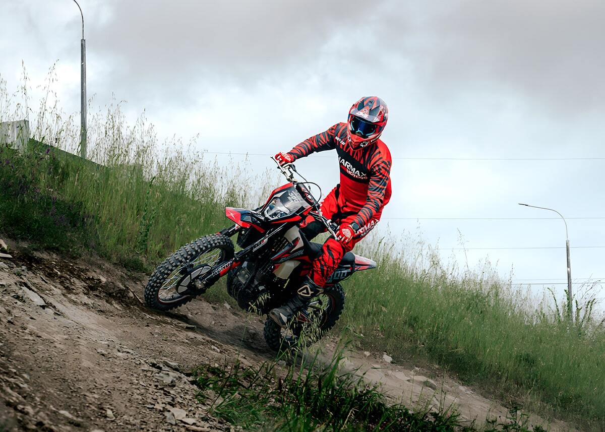 Статус премиального эндуро байка дополняет эргономичный конический руль Twin Wall. Материал — высокопрочный алюминий. Грипсы мягкие и не скользят, защита для рук выдержит сотни падений. Вам останется лишь уверенно схватиться за руль и полететь вперёд со скоростью ветра.