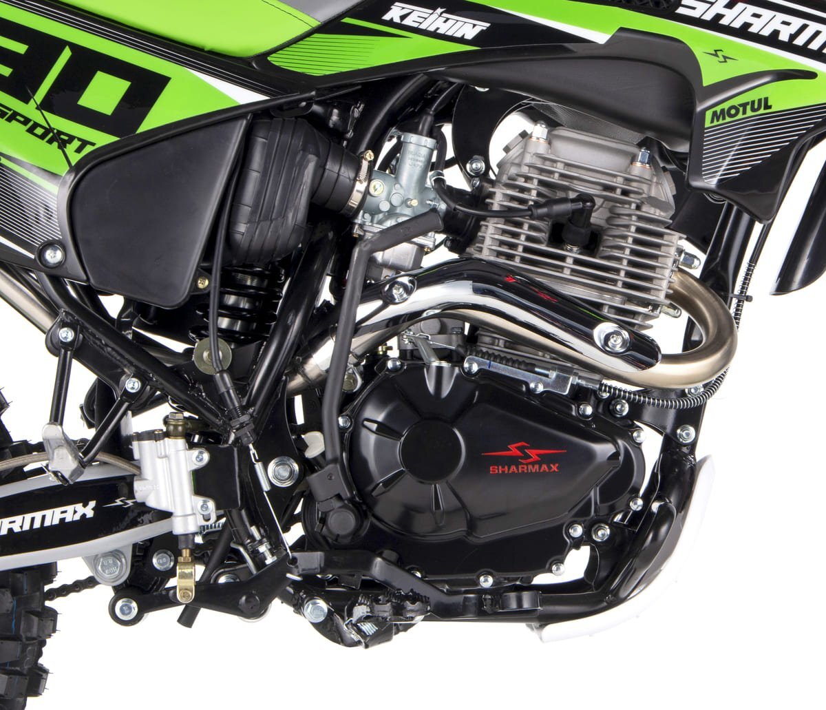 Обновлённый, Sharmax Sport 280 PR станет идеальным спутником для тех, кто начинает своё путешествие в мир эндуро.Улучшенная подвеска, новый двигатель с балансировочным валом усовершенствованная тормозная система! В основе — качество и надёжность. Двигатель Идеально сбалансированный двигатель 172 FMM3A, от концерна Zongshen, с балансировочным валом будто был создан для этого байка. 250 куб. см и 21 л.с. — более чем достаточно для быстрого старта. Этот силовой аппарат сделан, чтобы показать оптимальное сочетание полезной мощности и низкого веса. Трансмиссия 5-ступенчатая коробка передач с шестернями из прочного кованного металла практически не изнашивается с течением времени. Лапка переключения — алюминиевая и складная, не пострадает даже в случае жёсткого приземления. Не рекомендуем проверять её на прочность, просто поверьте нам на слово. Подвеска Подвеску можно настроить под грязь, камни и песок без потери качества. В конструкции задней подвески расположена прогрессия, позволяющая с комфортом передвигаться по мелкой щебёнке и преодолевать прыжки без ущерба для амортизатора. Байк легко настроить под свой вес, подобрав идеальный баланс жёсткости. Охлаждение Sharmax Sport 280 PR оборудован системой воздушного охлаждения. Нет громоздкого радиатора, вес байка стал меньше, управляемость — лучше. Просто нажмите на газ — и вперёд! За температуру не переживайте — не перегреетесь. Идеальная геометрия Симметричная дуплексная рама, позаимствованная у профессиональных гоночных байков, обеспечит оптимальную жёсткость и отзывчивость. Отдельно проваренные швы дают дополнительную прочность конструкции мотоцикла. Благодаря такой форме райдер и байк становятся одним целым, с лёгкостью преодолевая любые препятствия трека. Аккумулятор Двигатель питает мощный литий-ионный аккумулятор ёмкостью 7 А/ч. Не подведёт и не разрядится в самый важный момент, обеспечит быстрый старт мотора. Все провода для удобства спрятаны под сиденье, так что за цепляться ветки и вылетать на ходу точно не будут. Дизайн Устойчивость, манёвренность и надёжность сполна компенсируются дерзким и броским дизайном. Хотите стать самым заметным на треке? Sharmax Sport 280 PR вам в этом поможет.