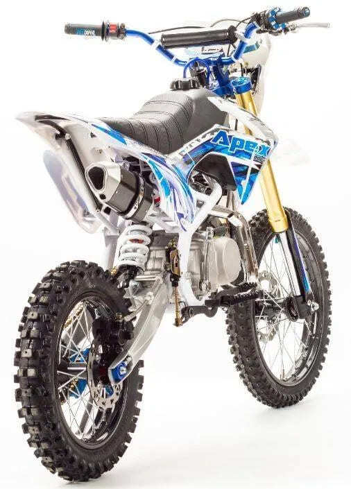 Недорогой надёжный питбайк APEX125 идеален для поездок по грунтовым дорогам и бездорожью. Хорошо чувствует себя на мягком и среднем грунте. Питбайк прост в управлении и не требует специального ухода, подойдёт как новичкам, так и любителям мотокросса. У питбайк отличный узнаваемый дизайн. Конструкция подчёркивает неуступчивый спортивный характер, который не остановится ни перед одним препятствием. Пластик комбинированный, прочный, не ломается при сгибании. Передняя подвеска — телескопическая нерегулируемая вилка перевёрнутого типа, которая отлично подходит для преодоления ям, ухабов и других неровностей плохих дорог или их отсутствия. Задняя подвеска маятниковая с моноамортизатором. Руль 22 мм с высоким подъёмом и перекладиной удобен для мотоциклистов разного роста. Ручки руля — комфортные PRO TAPER. Питбайк весит всего 75 кг, выдерживает вес до 90 кг. Оснащён CNC траверсами, рама полудуплексная стальная, мотоцепь качественная. Колёса спицованные, металлические. Размер заднего колеса — 14 дюймов, переднего — 17 дюйм. Тормоза дисковые, передний тормозной суппорт двухпоршневой, задний — однопоршневой. Питбайк оснащён карбюратором NIBBI PE19 и одноцилиндровым четырёхтактным двигателем с воздушным охлаждением. Надёжный мотор мощностью 8 л. с. и объемом 125 см³ разгоняет кроссовый мотоцикл APEX125 до 90 км/ч. Коробка передач механическая, четырёхступенчатая. Система зажигания электронная (CDI). Запуска двигателя - кикстартер. Покрышки с шипами и высоким грунтозацепом идеальны для бездорожья. Мощность мотора и небольшой вес питбайка позволяют ему преодолевать значительные препятствия и непролазную грязь, хорошо заходить в подъёмы. Для поездок при низкой видимости и в ночное время суток питбайк оснащён LED фарой. Питбайк относится к недорогим моделям, которые при должной эксплуатации работают без сбоев и капризов. Неприхотлив в обслуживании, не занимает много места в гараже. При необходимости в нём легко сменить любую повреждённую деталь.