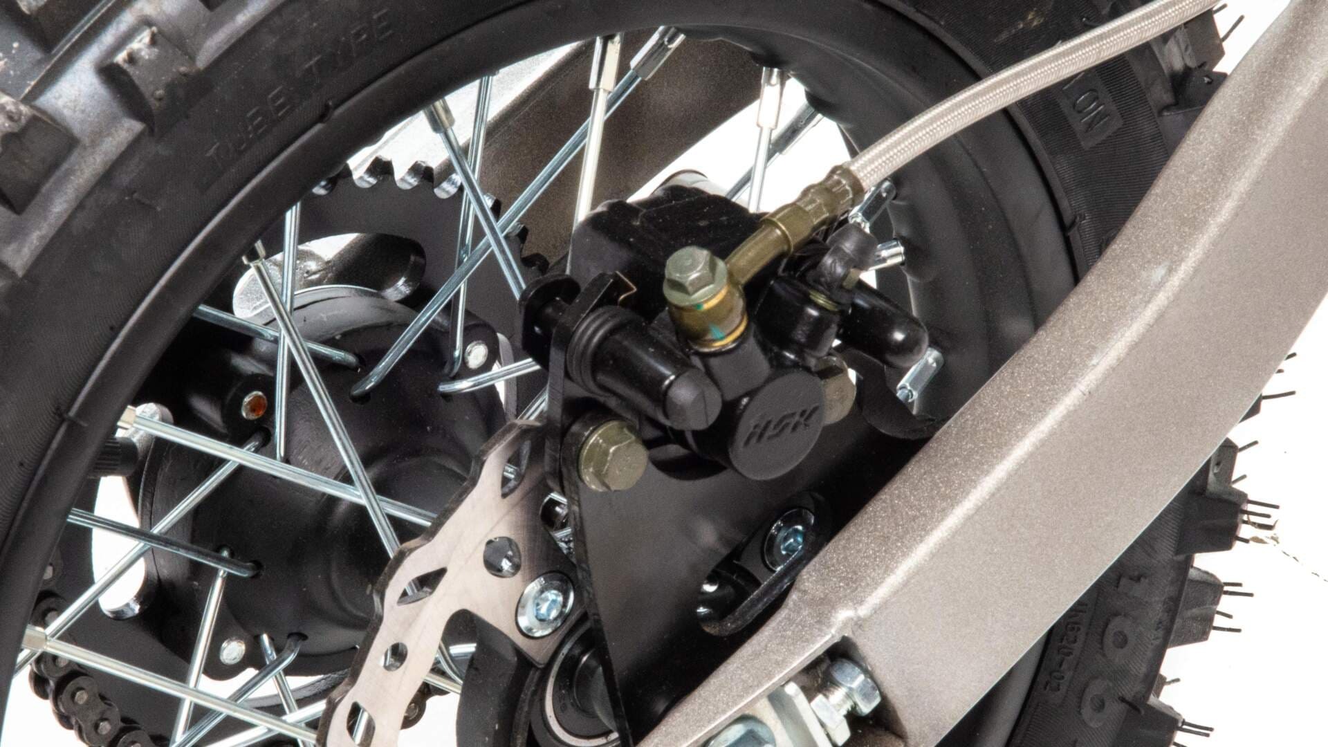 Тормоза дисковые, передний тормозной суппорт двухпоршневой, задний — однопоршневой. Питбайк относится к недорогим моделям, которые при должной эксплуатации работают без сбоев. Не занимает много места в гараже. При необходимости в нём легко сменить любую повреждённую деталь.