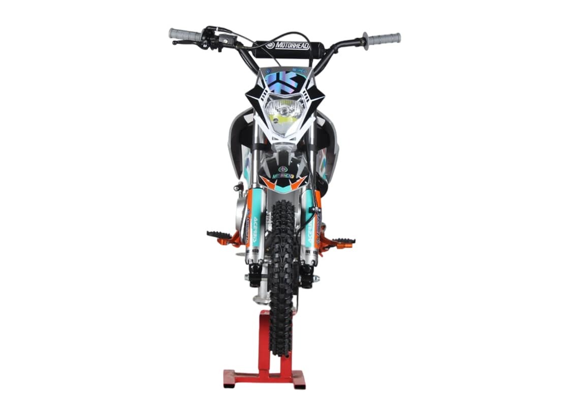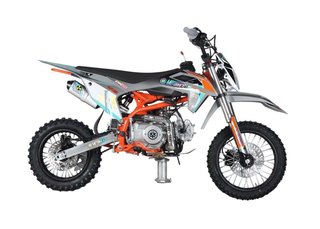 MOTORHEAD CSA110 14/12 - лёгкий детский питбайк с двигателем 110 см³. Оснащён полуавтоматической коробкой передач и воздушным охлаждением. Имеет прочную стальную раму и надёжные дисковые тормоза. Отличается удобной посадкой и мягкой подвеской. Подходит для детей и подростков до 14 лет.