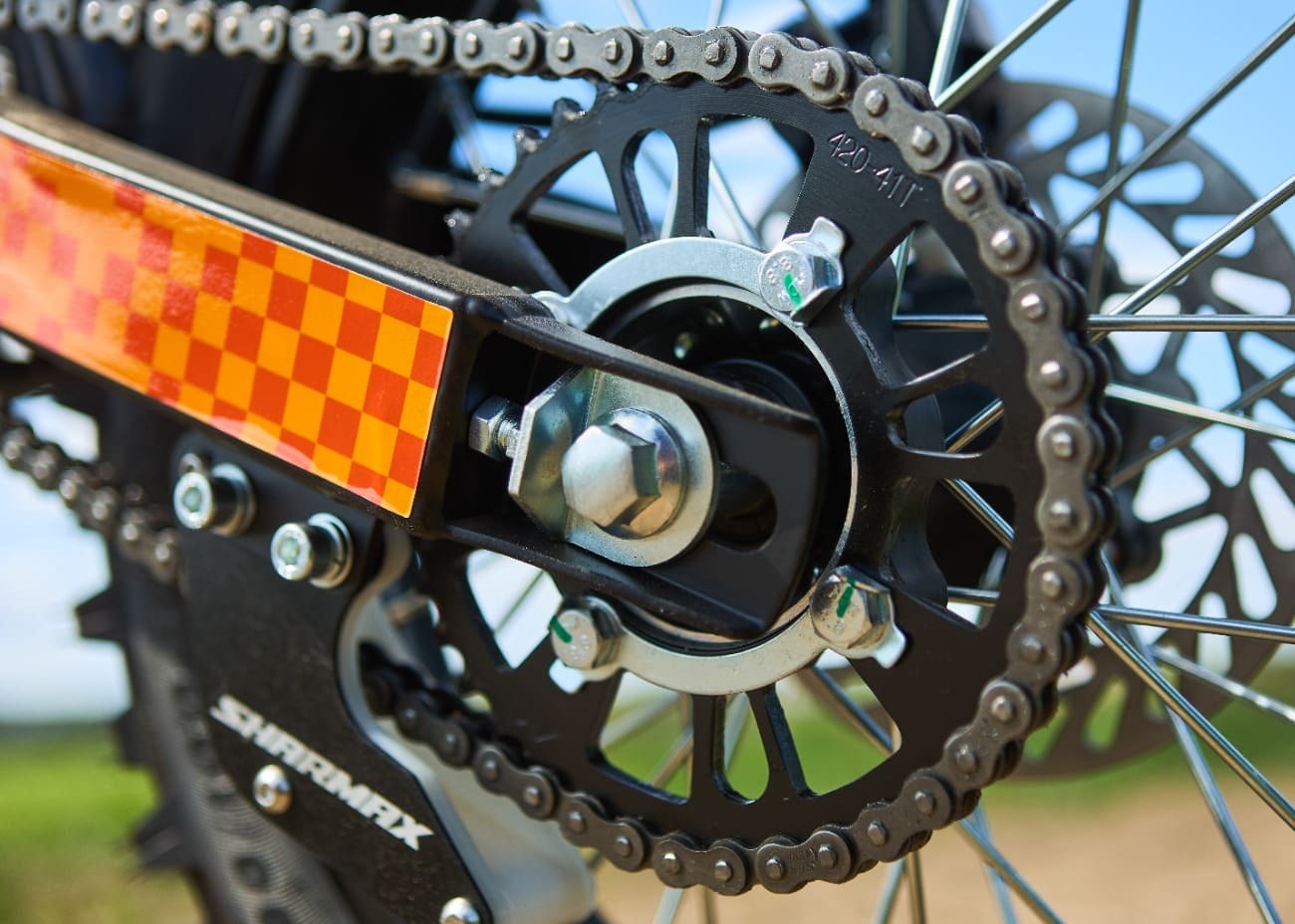 Задняя подвеска с регулировкой преднатяга пружины помогает питбайку не вилять на поворотах и стабильно проходить все сложные участки трассы. Стальной маятник изготовлен из надёжного хромомолибденового сплава.
