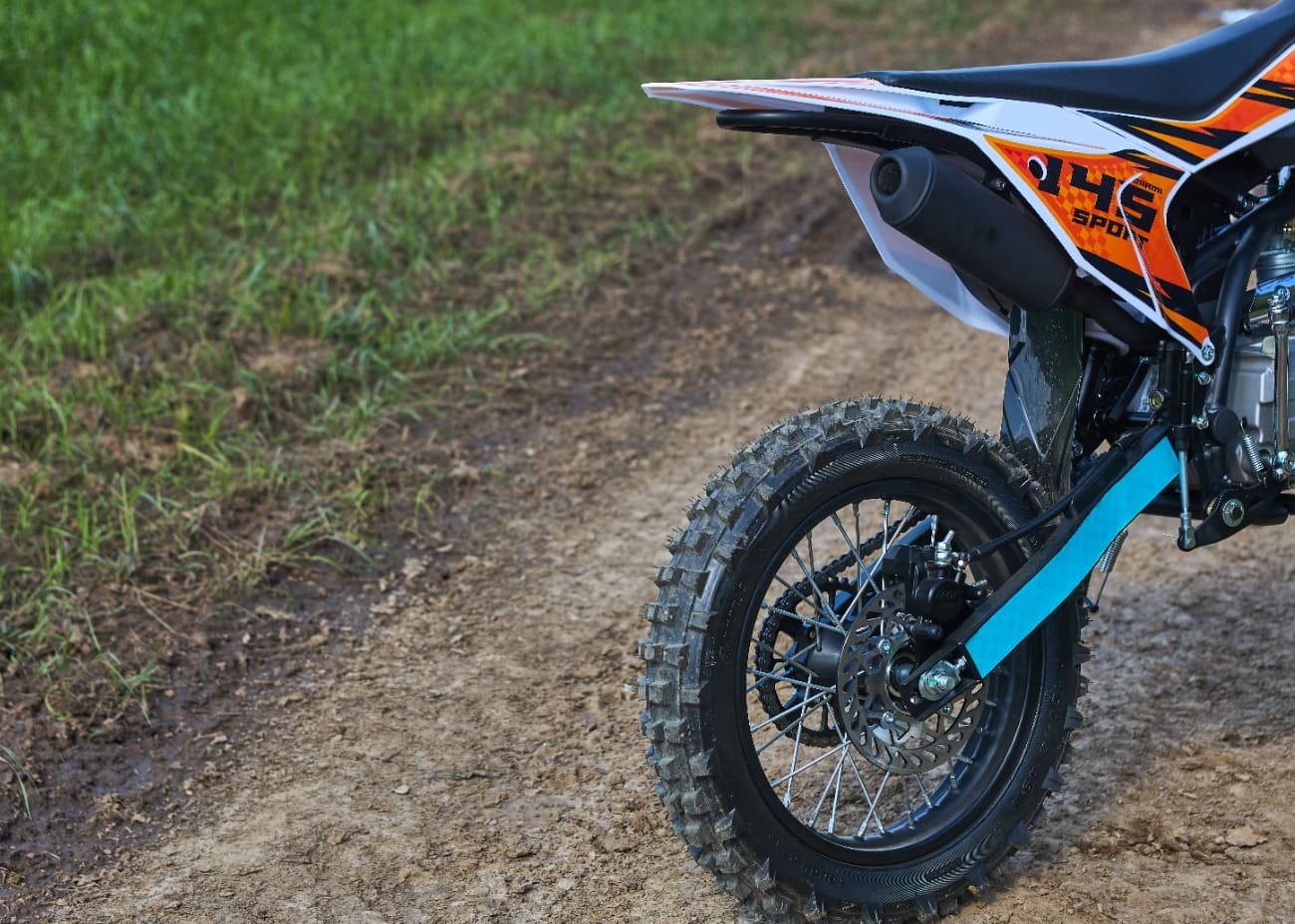 Удлиненная колесная база 1210 мм увеличивает устойчивость питбайка и позволяет гонщику комфортно держаться даже на раскисших от дождя дорогах. Диаметр колёс составляет 17/14 дюймов.