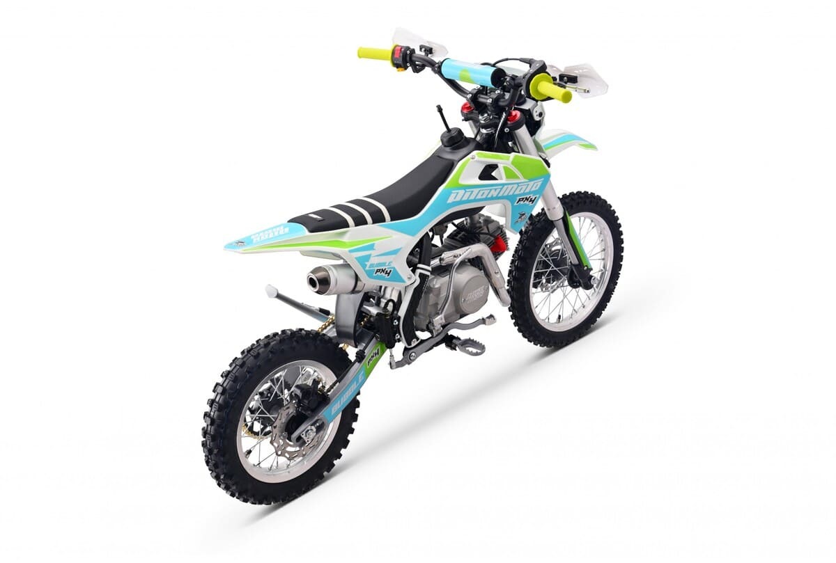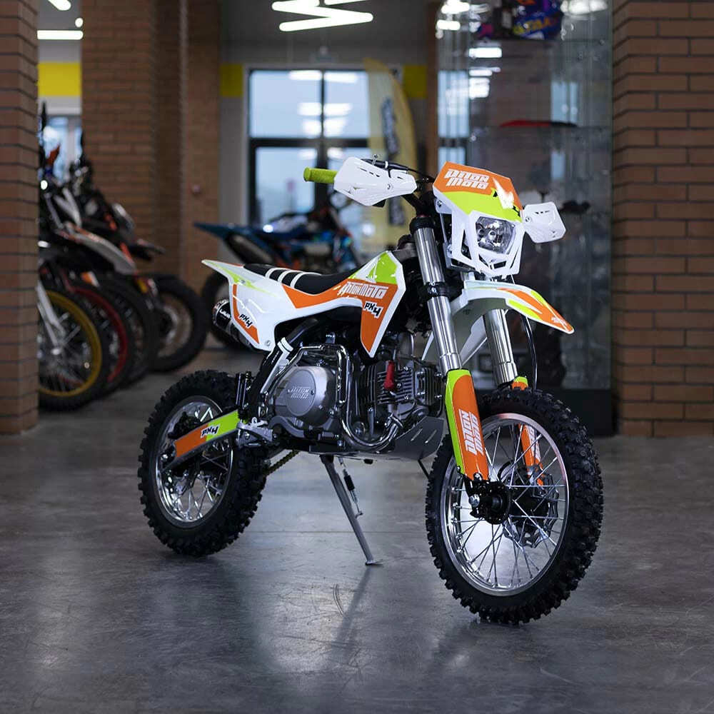 В продаже детский питбайк для подростка 8-14 лет PitonMoto PX4 125 на колесах 14 12. Есть модель как механике, так и на полуавтомате. Подходит для райдеров ростом 120-140 см и весом до 50 кг.