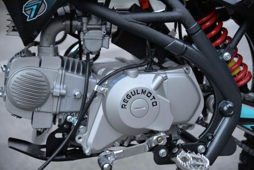 Питбайк Regulmoto Seven Medalist PRO на алюминиевых колесных дисках 17 и 14 дюймов стал новой обновленной версией популярной техники. Его стильный дизайн с оригинальной расцветкой выполнены с помощью высококачественного пластика Betta. Движущая сила байка заключена в 140-кубовом четырехтактном моторе с воздушным охлаждением, слаженную работу которого обеспечивает карбюратор PE19 от Nibbi Racing и 4-скоростная механическая КПП. Запуск можно осуществлять как с помощью электростартера, так и классическим кикстартером.