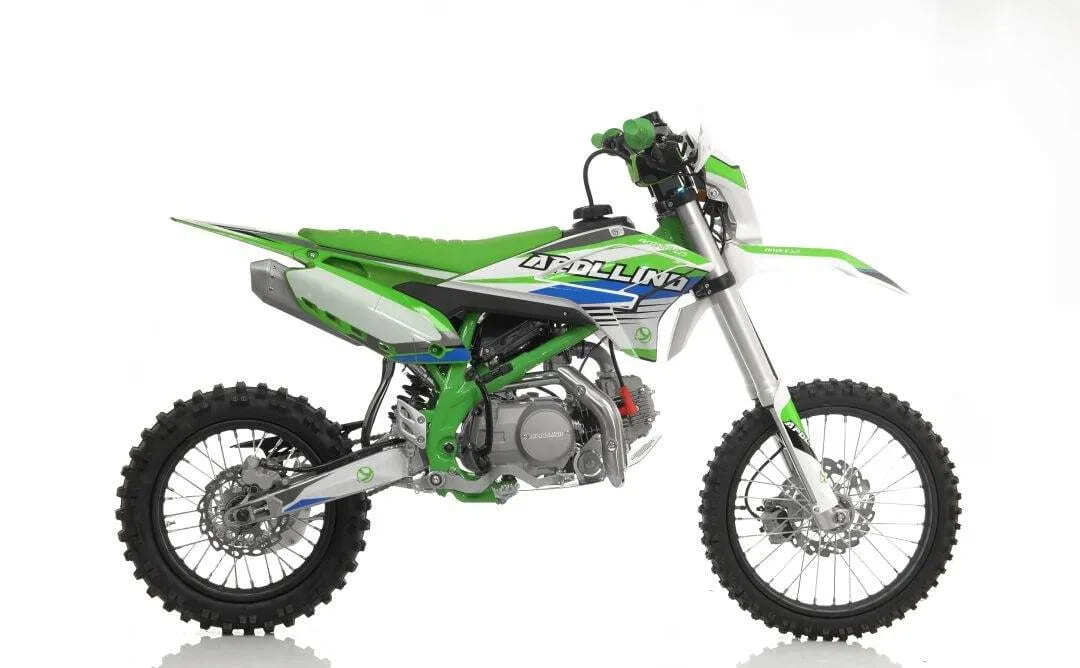 Питбайк Yacota Apollino 125 для подростков. Оснащен надежным и тяговитым 4-х тактным двигателем YX125, питаемый карбюратором Nibbi PE19. Выдает 8 л.с. Питбайк имеет 4-ступенчатую механическую трансмиссию. Запуск мотора осуществляется при помощи электростартера или кик-стартера. Классические для питбайков колеса 17/14 оснащены буксаторами, предотвращающими проворачивание покрышки на ободе.