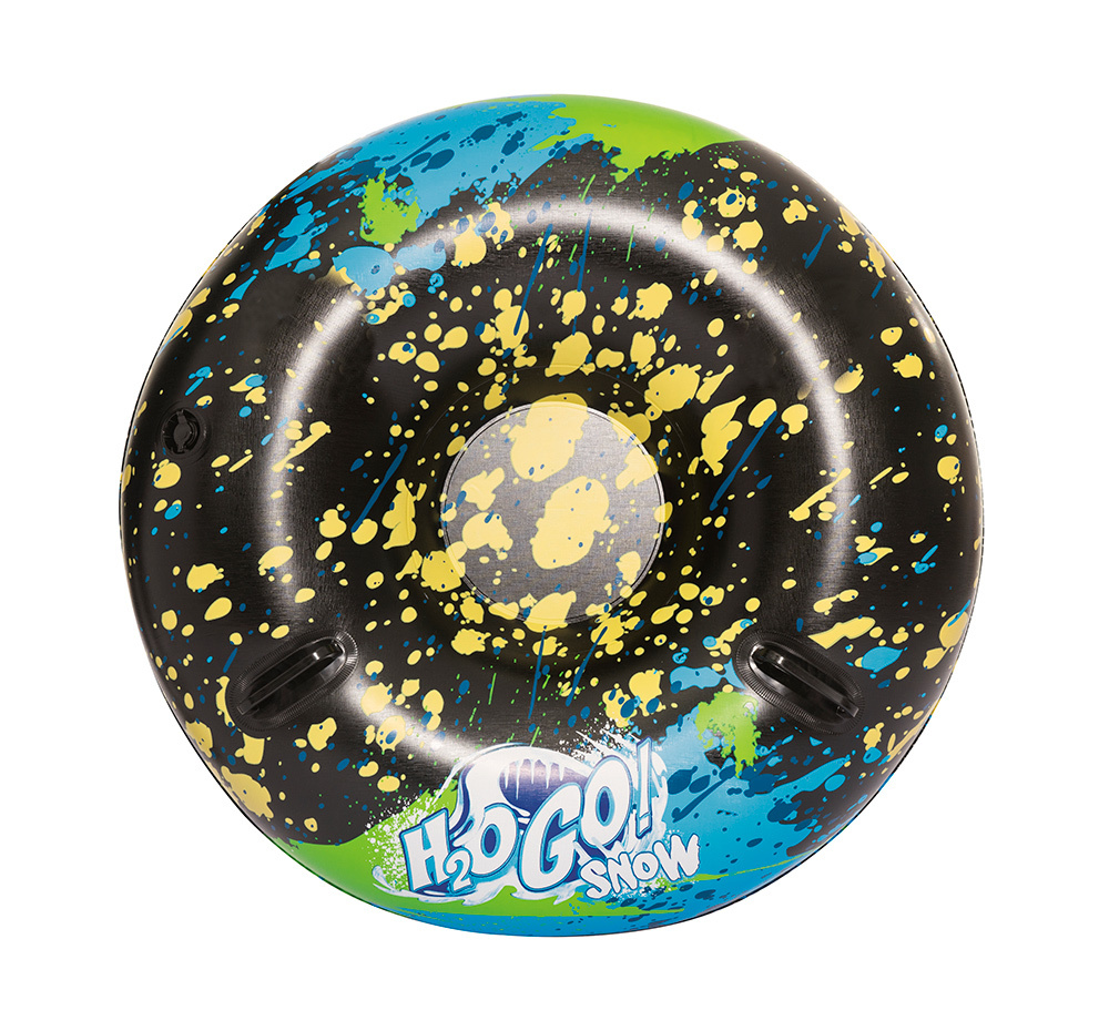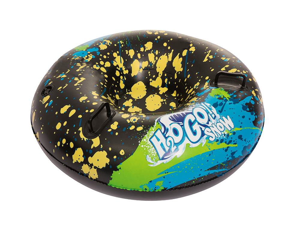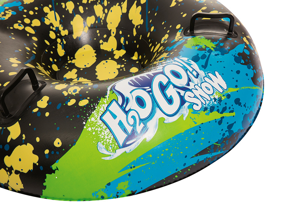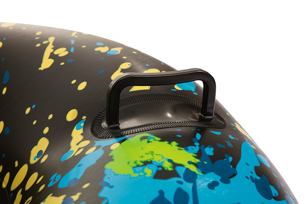 Тюбинг выполнен из принтованной морозостойкой ткани высокой плотности. На верхнюю ткань нанесено покрытие, которое отталкивает воду и грязь. Камера для тюбинга не имеет токсичного запаха в отличии от автомобильной камеры.Накачивать можно,как автомобильным(велосипедным) насосом,так и насосом для матраса.