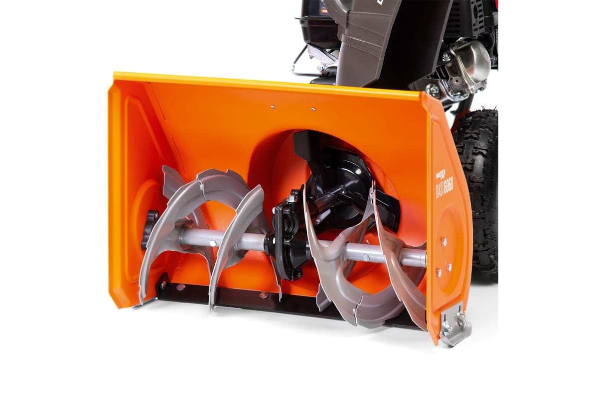 - Металлический желоб для выброса снега. Находится в удобном месте, позволяет перенаправлять выброс снега до 180 градусов с помощью рычага.