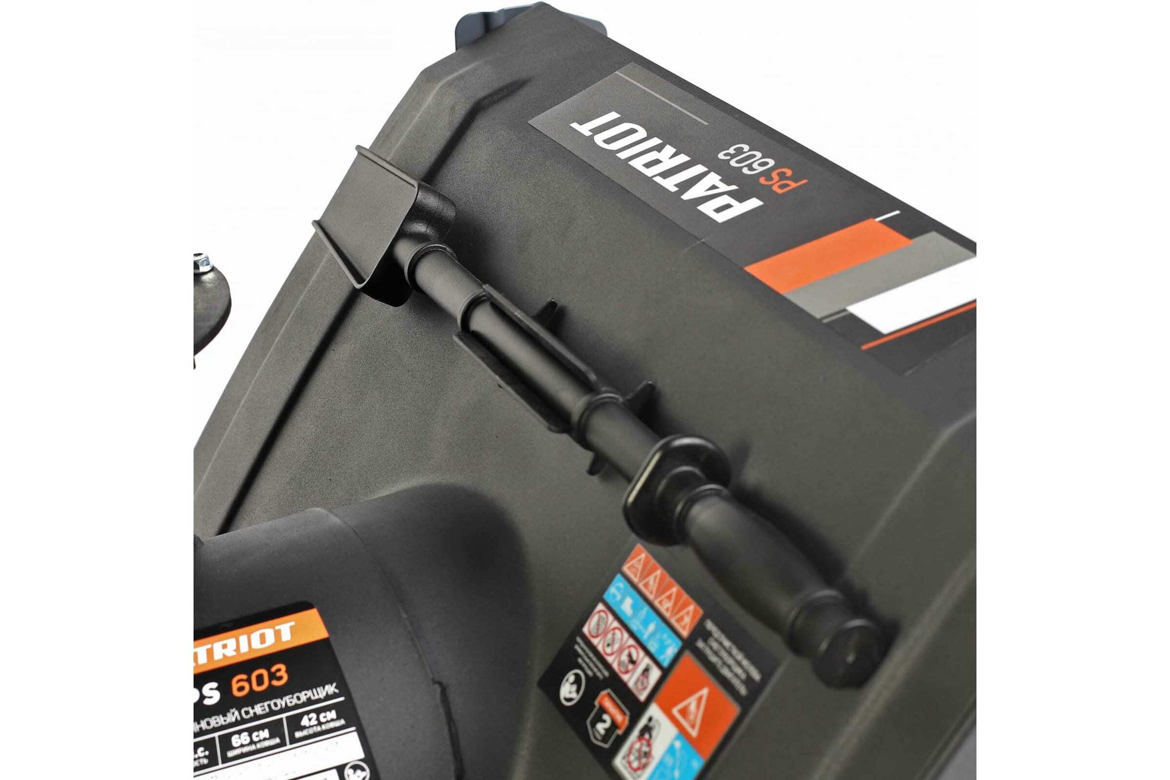 - Снегоуборочная техника Patriot PS 603E оснащена четырехтактным двигателем, который имеет мощность 6,5 л.с.