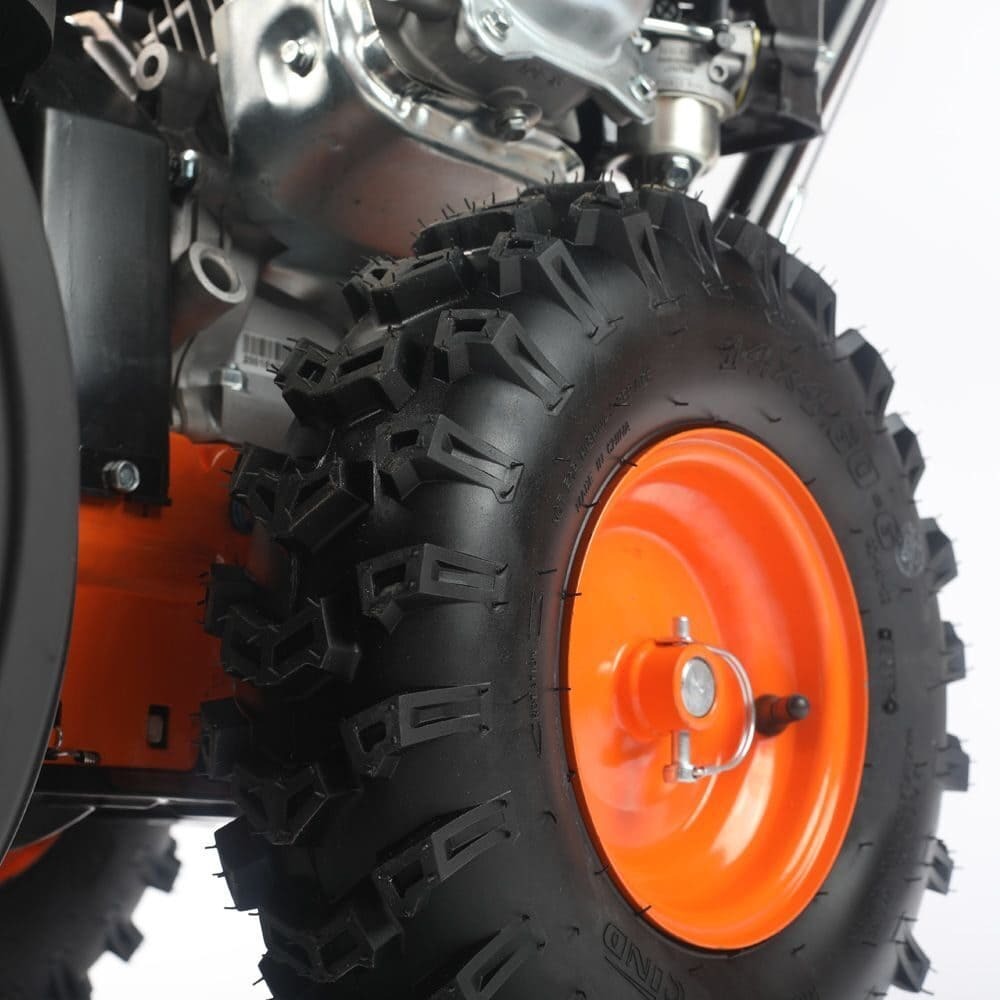 - Металлический желоб для выброса снега - не деформируется при отрицательной температуре. Специальный рисунок протектора колес - не пробуксовывает на льду и уверенно идет по любому снегу.