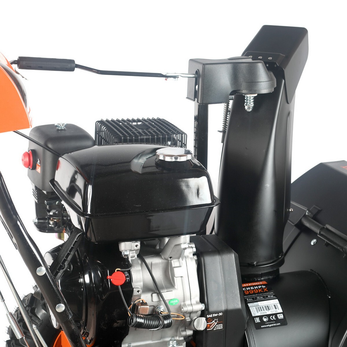 - Управление скоростью, углом и дальностью выброса снега происходит через центральную консоль.
