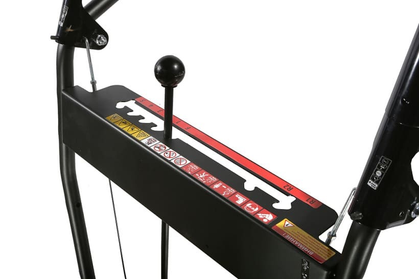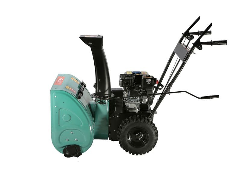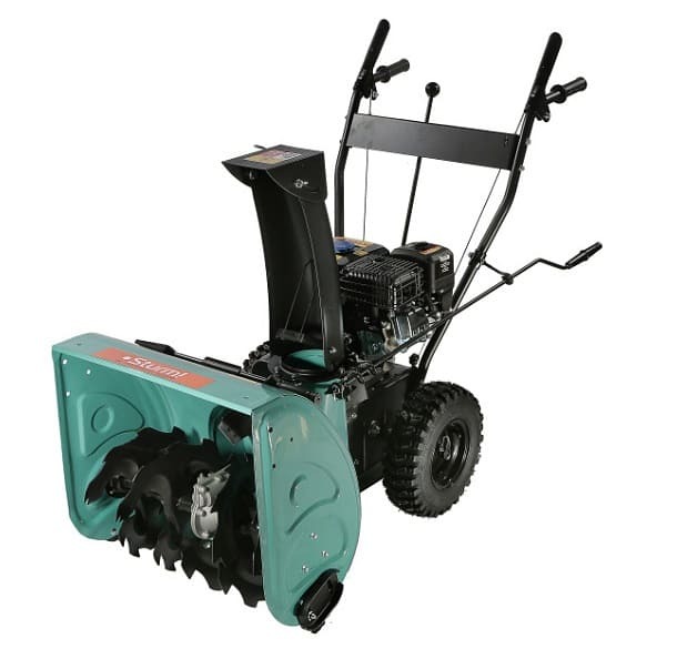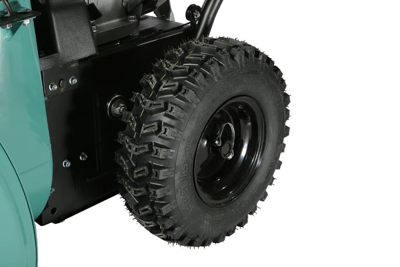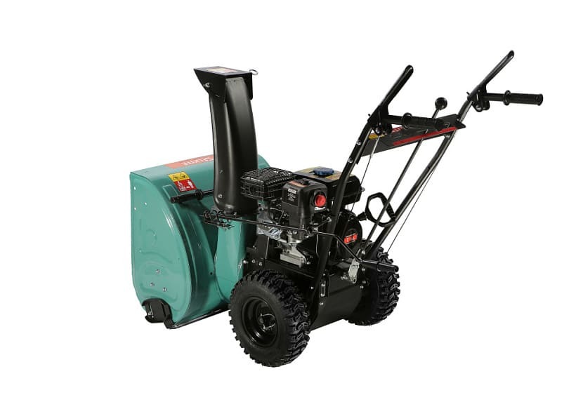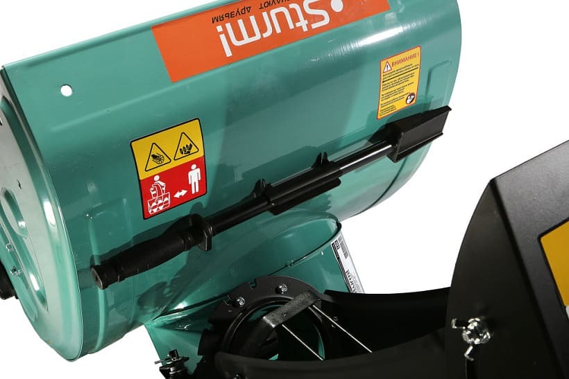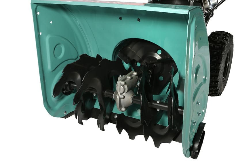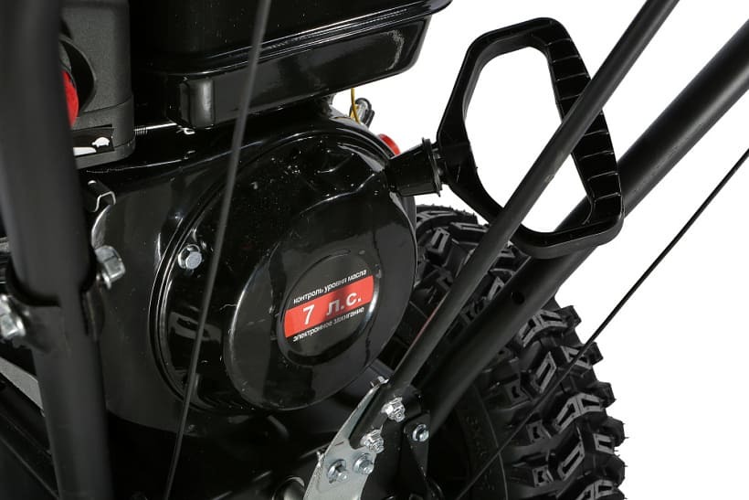 Зазубренный шнек первой ступени успешно измельчает слежавшийся снег и может справиться даже с настом толщиной до 2 см. Высокооборотистая вторая ступень снегоуборочного агрегата отбрасывает снег на расстояние до 12 м. Широкие колеса с развитым анти-снежным протектором позволяют уверенно двигаться по рыхлому снегу.