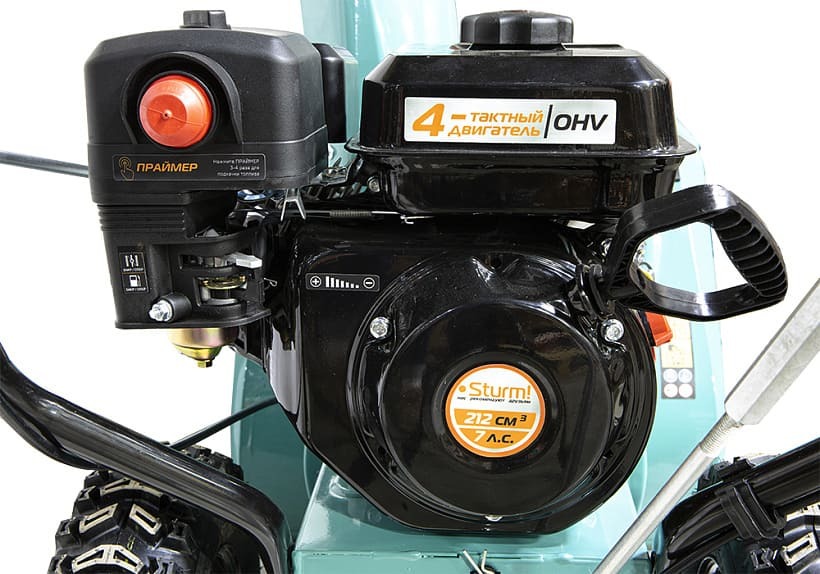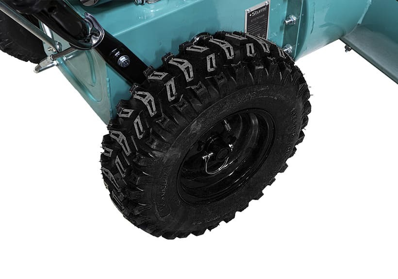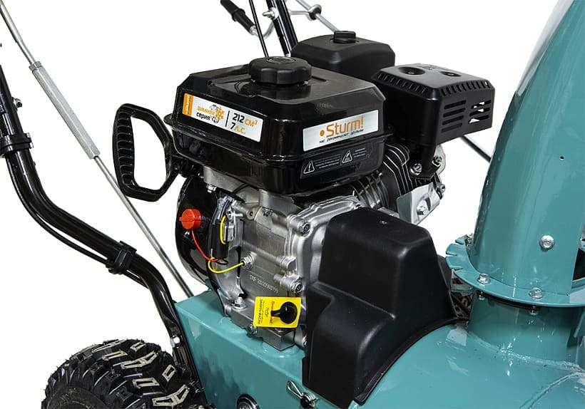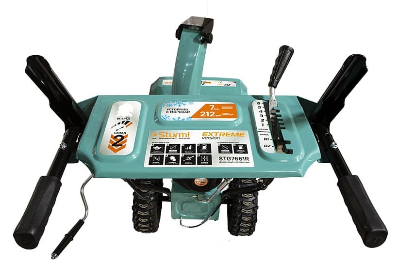 Бензиновый снегоуборщик Sturm! STG7661R это самоходная двухступенчатая снегоуборочная машина оснащена зимним вариантом надежного четырехтактного бензинового двигателя модели 170F. Система управления двигателем обеспечивает его работу в оптимальном диапазоне максимального крутящего момента, что даёт хорошую энерговооружённость для выполнения тяжёлых работ. "Сухая" гильза цилиндра двигателя из высокопрочного материала обеспечивает долговечность цилиндропоршневой группы. Зазубренный шнек первой ступени успешно измельчает слежавшийся снег и может справиться даже с настом толщиной до 2 см. Высокооборотистая вторая ступень снегоуборочного агрегата отбрасывает снег на расстояние до 12 м. Широкие колеса с развитым анти-снежным протектором позволяют уверенно двигаться по рыхлому снегу.