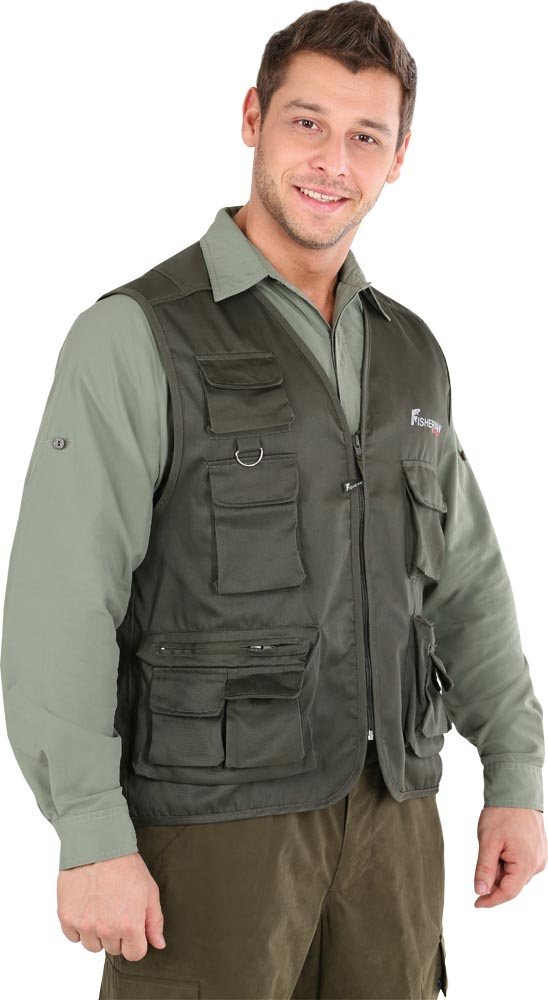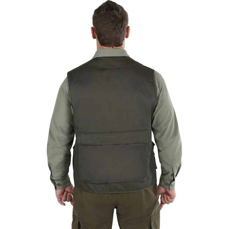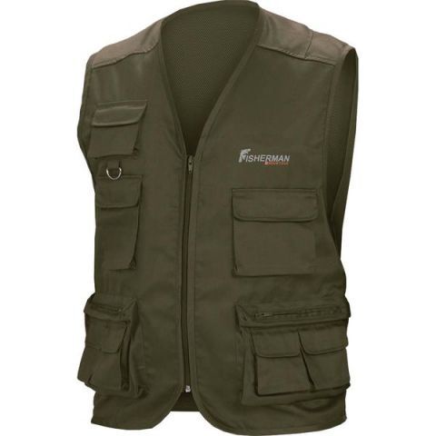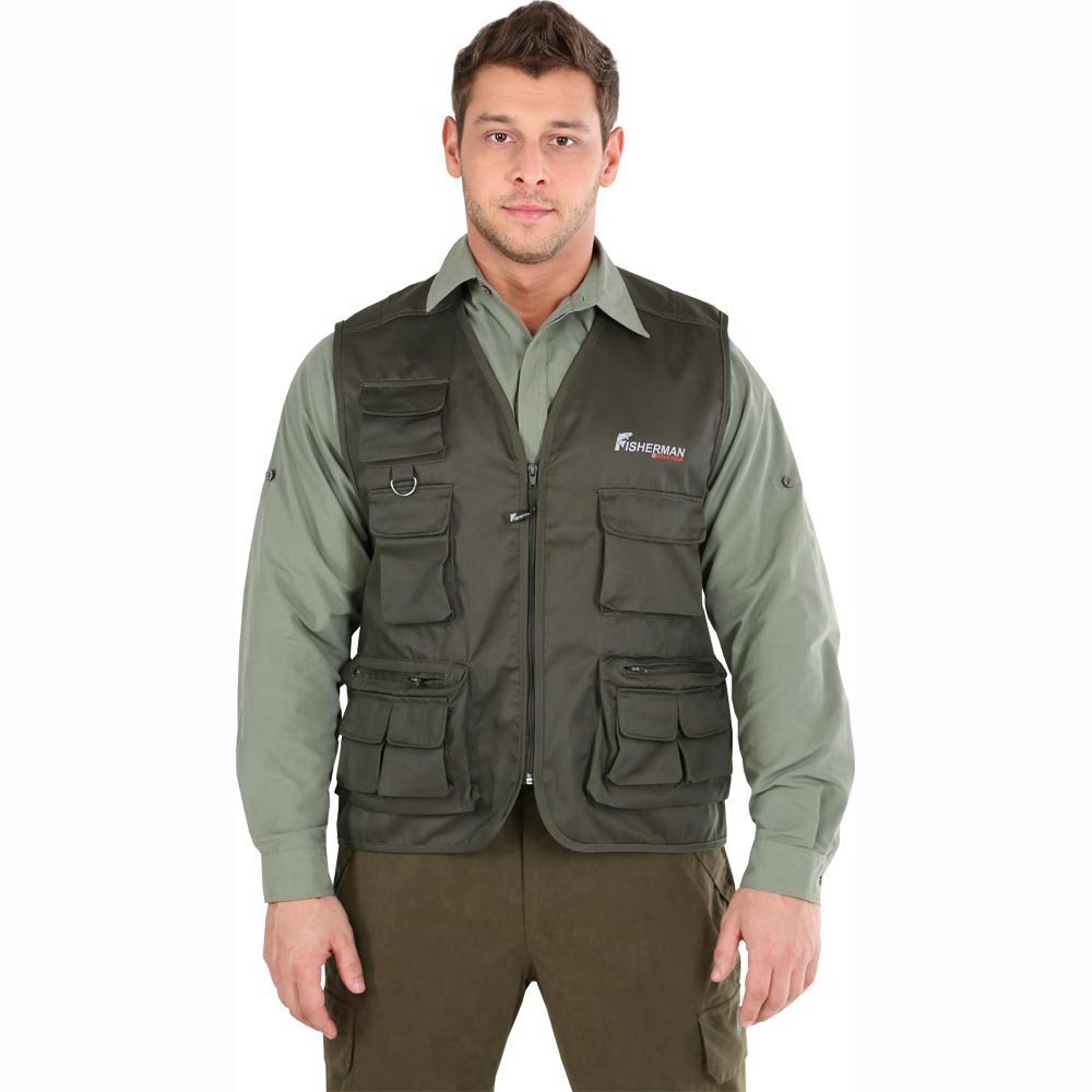 Многофункциональный жилет из смесовой ткани на подкладке из сетки. Центральная застежка молния и трикотажный воротник. Боковые регулировки по объему. На полочке 6 грузовых карманов разного объема и 2 прорезных кармана, на верхнем кармане липучка - Velcro - для крепления снастей. Для поддержки удилища, есть крепление "Третья рука". На спинке 1 большой грузовой карман.